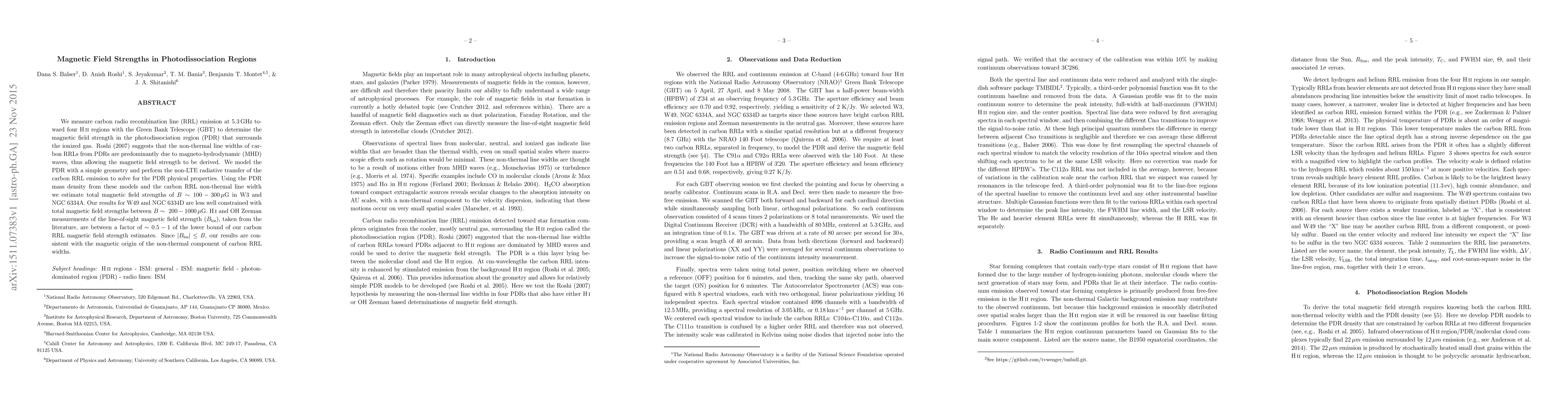 We measure carbon radio recombination line (RRL) emission at 5.3 GHz toward four HII regions with the Green Bank Telescope (GBT) to determine the magnetic field strength in the photodissociation region (PDR) that surrounds the ionized gas. Roshi (2007) suggests that the non-thermal line widths of carbon RRLs from PDRs are predominantly due to magneto-hydrodynamic (MHD) waves, thus allowing the magnetic field strength to be derived. We model the PDR with a simple geometry and perform the non-LTE radiative transfer of the carbon RRL emission to solve for the PDR physical properties. Using the PDR mass density from these models and the carbon RRL non-thermal line width we estimate total magnetic field strengths of B ~ 100-300 micro Gauss in W3 and NGC6334A. Our results for W49 and NGC6334D are less well constrained with total magnetic field strengths between B ~ 200-1000 micro Gauss. HI and OH Zeeman measurements of the line-of-sight magnetic field strength (B_los), taken from the literature, are between a factor of ~0.5-1 of the lower bound of our carbon RRL magnetic field strength estimates. Since |B_los| <= B, our results are consistent with the magnetic origin of the non-thermal component of carbon RRL widths.