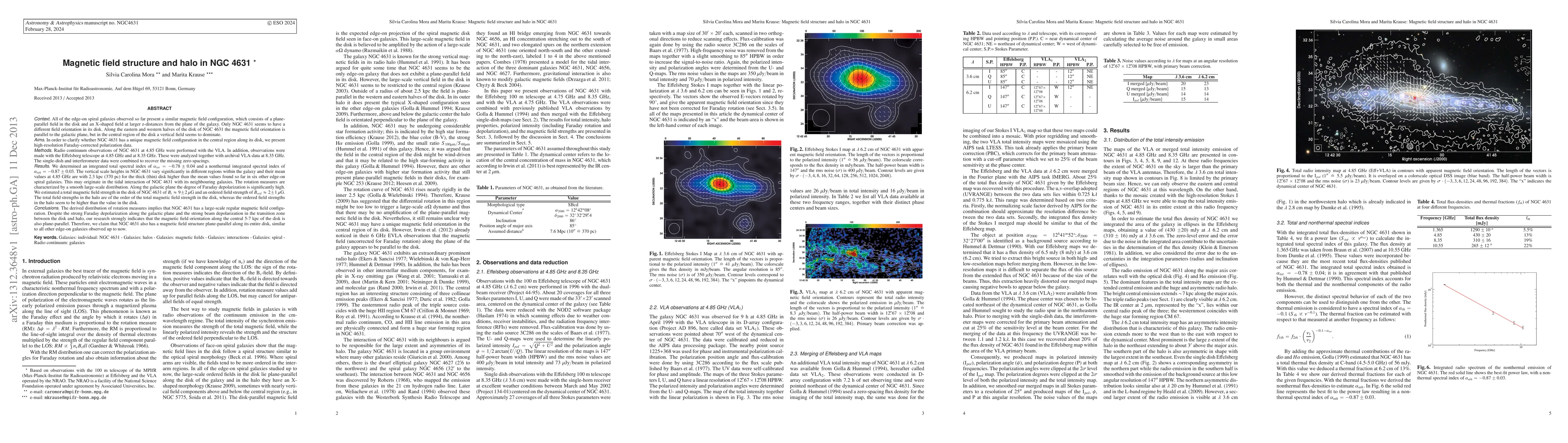 Researchers studied NGC 4631's magnetic field structure, finding a plane-parallel configuration along its disk with significant variations in vertical scale heights across regions.