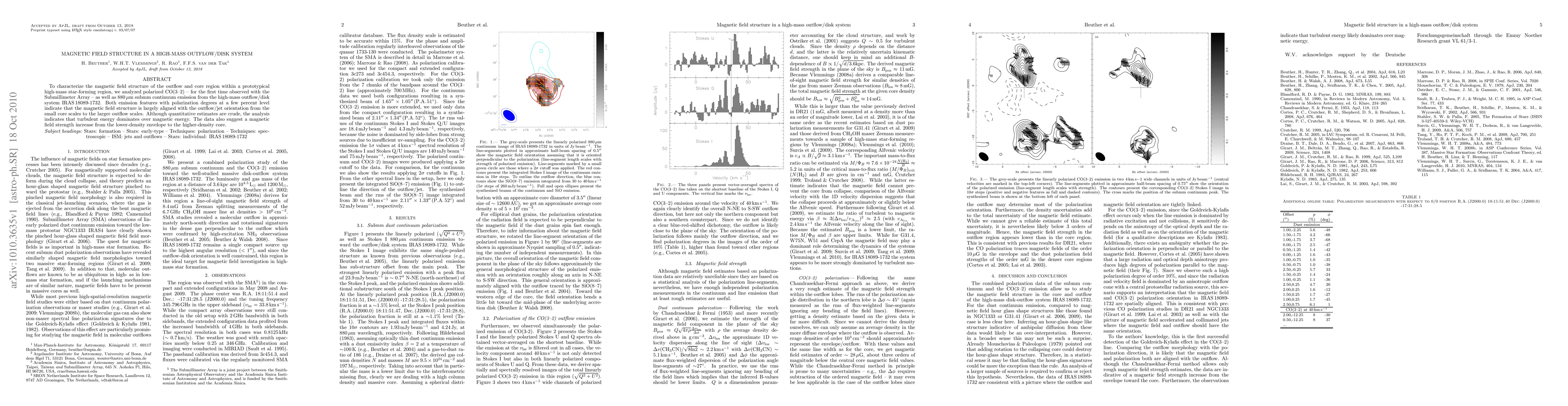 To characterize the magnetic field structure of the outflow and core region within a prototypical high-mass star-forming region, we analyzed polarized CO(3-2) - for the first time observed with the Submillimeter Array -- as well as 880mum submm continuum emission from the high-mass outflow/disk system IRAS18089-1732. Both emission features with polarization degrees at a few percent level indicate that the magnetic field structure is largely aligned with the outflow/jet orientation from the small core scales to the larger outflow scales. Although quantitative estimates are crude, the analysis indicates that turbulent energy dominates over magnetic energy. The data also suggest a magnetic field strength increase from the lower-density envelope to the higher-density core.
