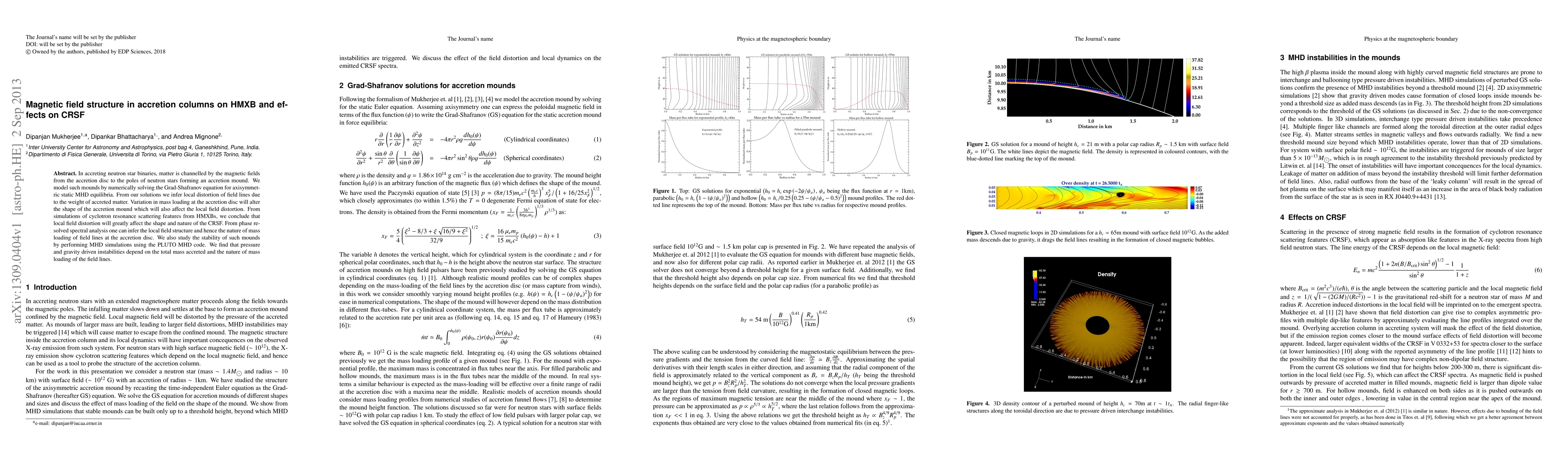 In accreting neutron star binaries, matter is channelled by the magnetic fields from the accretion disc to the poles of neutron stars forming an accretion mound. We model such mounds by numerically solving the Grad-Shafranov equation for axisymmetric static MHD equilibria. From our solutions we infer local distortion of field lines due to the weight of accreted matter. Variation in mass loading at the accretion disc will alter the shape of the accretion mound which will also affect the local field distortion. From simulations of cyclotron resonance scattering features from HMXBs, we conclude that local field distortion will greatly affect the shape and nature of the CRSF. From phase resolved spectral analysis one can infer the local field structure and hence the nature of mass loading of field lines at the accretion disc. We also study the stability of such mounds by performing MHD simulations using the PLUTO MHD code. We find that pressure and gravity driven instabilities depend on the total mass accreted and the nature of mass loading of the field lines.
