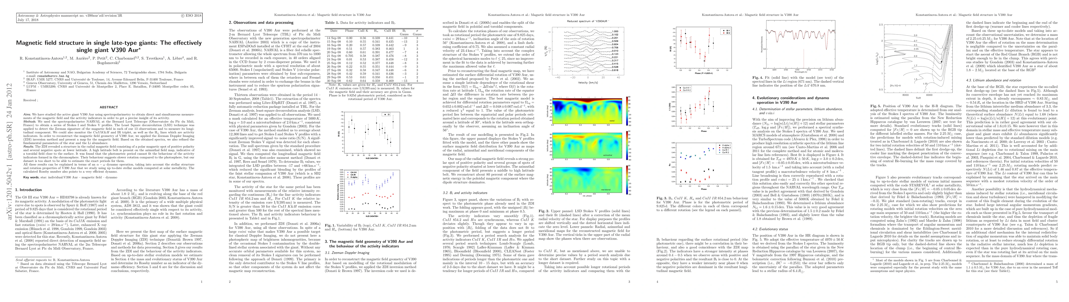 This study uses spectropolarimetry to analyze the magnetic field and activity indicators in the single late-type giant V390 Aur, revealing a complex magnetic structure with a polar magnetic spot and lower latitude negative spots. The findings suggest a dynamo mechanism and slower rotation in the chromosphere compared to the photosphere.