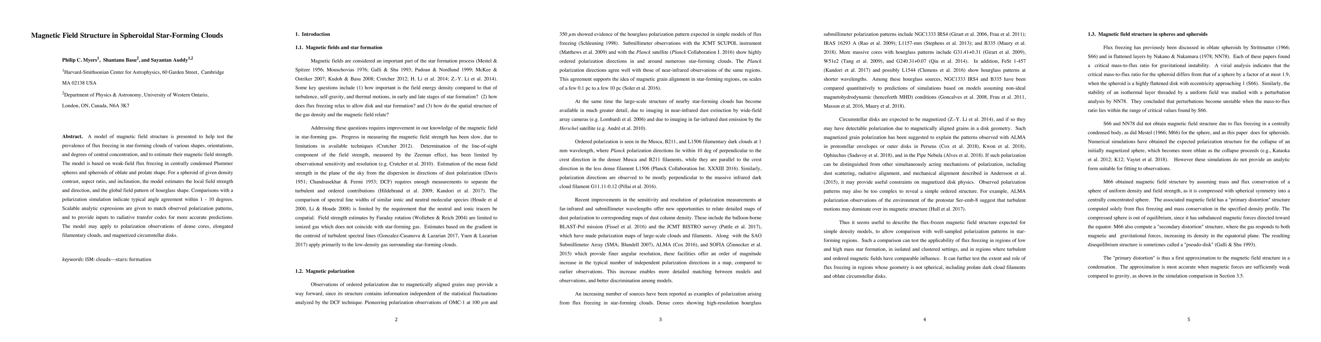This paper presents a model for magnetic field structure in spheroidal star-forming clouds, assessing flux freezing and estimating magnetic field strength. The model predicts local field strength and global hourglass patterns, with agreement within 1-10 degrees compared to polarization simulations.