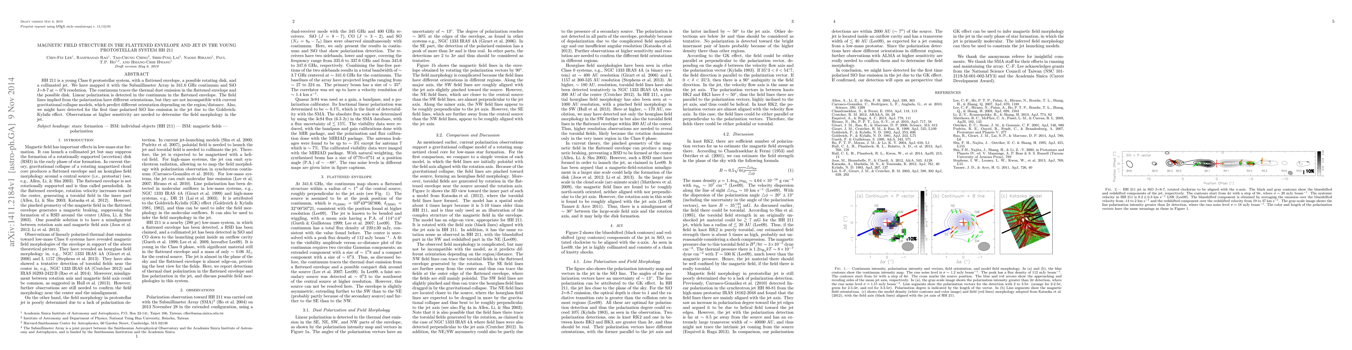 HH 211 is a young Class 0 protostellar system, with a flattened envelope, a possible rotating disk, and a collimated jet. We have mapped it with the Submillimeter Array in 341.6 GHz continuum and SiO J=8-7 at ~ 0.6 resolution. The continuum traces the thermal dust emission in the flattened envelope and the possible disk. Linear polarization is detected in the continuum in the flattened envelope. The field lines implied from the polarization have different orientations, but they are not incompatible with current gravitational collapse models, which predict different orientation depending on the region/distance. Also, we might have detected for the first time polarized SiO line emission in the jet due to the Goldreich-Kylafis effect. Observations at higher sensitivity are needed to determine the field morphology in the jet.