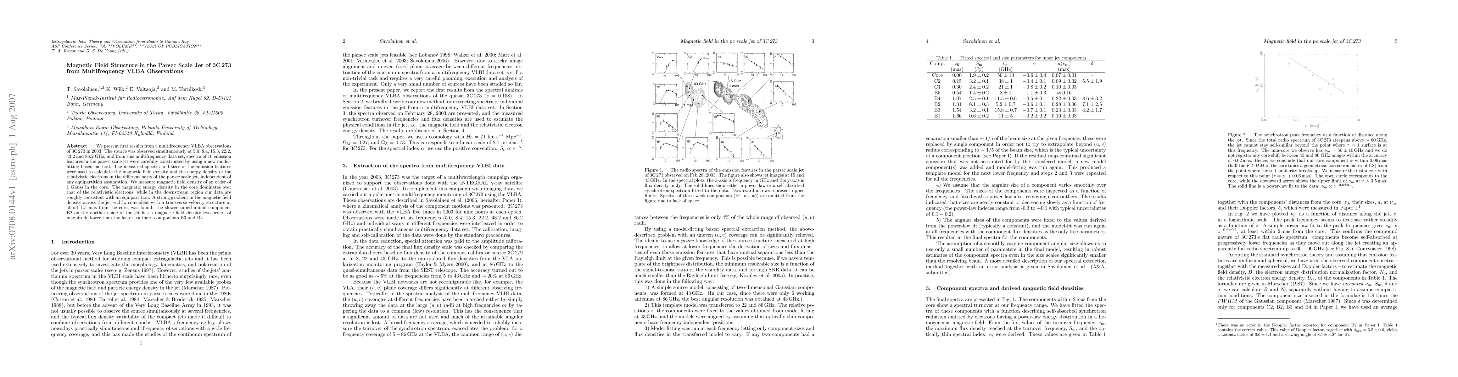 We present first results from a multifrequency VLBA observations of 3C273 in 2003. The source was observed simultaneously at 5.0, 8.4, 15.3, 22.2, 43.2 and 86.2 GHz, and from this multifrequency data set, spectra of 16 emission features in the parsec scale jet were carefully constructed by using a new model-fitting based method. The measured spectra and sizes of the emission features were used to calculate the magnetic field density and the energy density of the relativistic electrons in the different parts of the parsec scale jet, independent of any equipartition assumption. We measure magnetic field density of an order of 1 Gauss in the core. The magnetic energy density in the core dominates over that of the relativistic electrons, while in the downstream region our data are roughly consistent with an equipartition. A strong gradient in the magnetic field density across the jet width, coincident with a transverse velocity structure at about 1.5 mas from the core, was found: the slower superluminal component B2 on the northern side of the jet has a magnetic field density two orders of magnitude lower than the faster southern components B3 and B4.