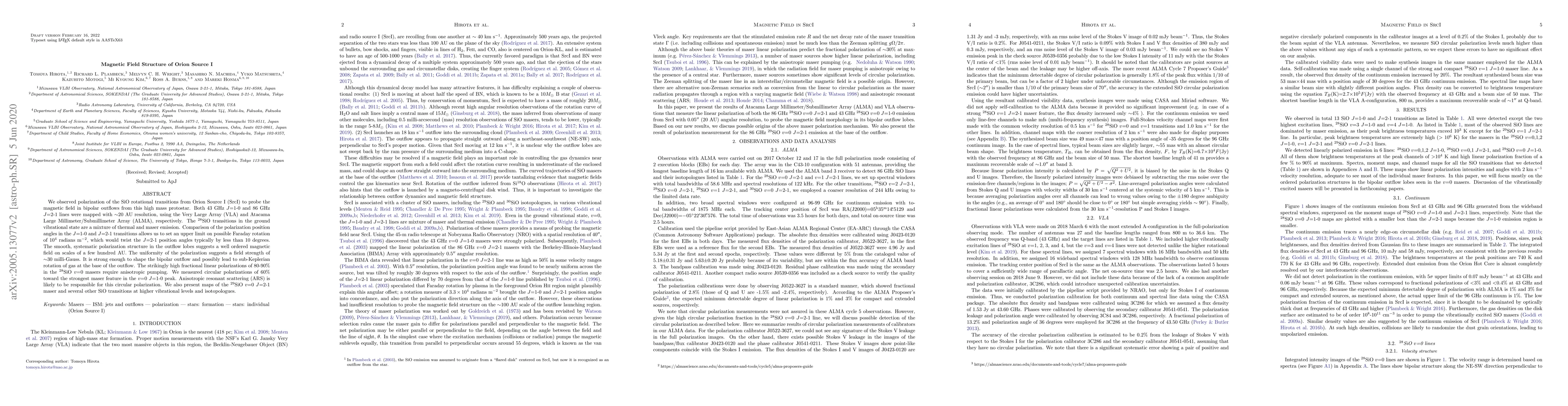 We observed polarization of the SiO rotational transitions from Orion Source I (SrcI) to probe the magnetic field in bipolar outflows from this high mass protostar. Both 43 GHz $J$=1-0 and 86 GHz $J$=2-1 lines were mapped with $\sim$20 AU resolution, using the Very Large Array (VLA) and Atacama Large Millimeter/Submillimeter Array (ALMA), respectively. The $^{28}$SiO transitions in the ground vibrational state are a mixture of thermal and maser emission. Comparison of the polarization position angles in the $J$=1-0 and $J$=2-1 transitions allows us to set an upper limit on possible Faraday rotation of $10^{4}$ radians m$^{-2}$, which would twist the $J$=2-1 position angles typically by less than 10 degrees. The smooth, systematic polarization structure in the outflow lobes suggests a well ordered magnetic field on scales of a few hundred AU. The uniformity of the polarization suggests a field strength of $\sim$30 milli-Gauss. It is strong enough to shape the bipolar outflow and possibly lead to sub-Keplerian rotation of gas at the base of the outflow. The strikingly high fractional linear polarizations of 80-90% in the $^{28}$SiO $v$=0 masers require anisotropic pumping. We measured circular polarizations of 60% toward the strongest maser feature in the $v$=0 $J$=1-0 peak. Anisotropic resonant scattering (ARS) is likely to be responsible for this circular polarization. We also present maps of the $^{29}$SiO $v$=0 $J$=2-1 maser and several other SiO transitions at higher vibrational levels and isotopologues.