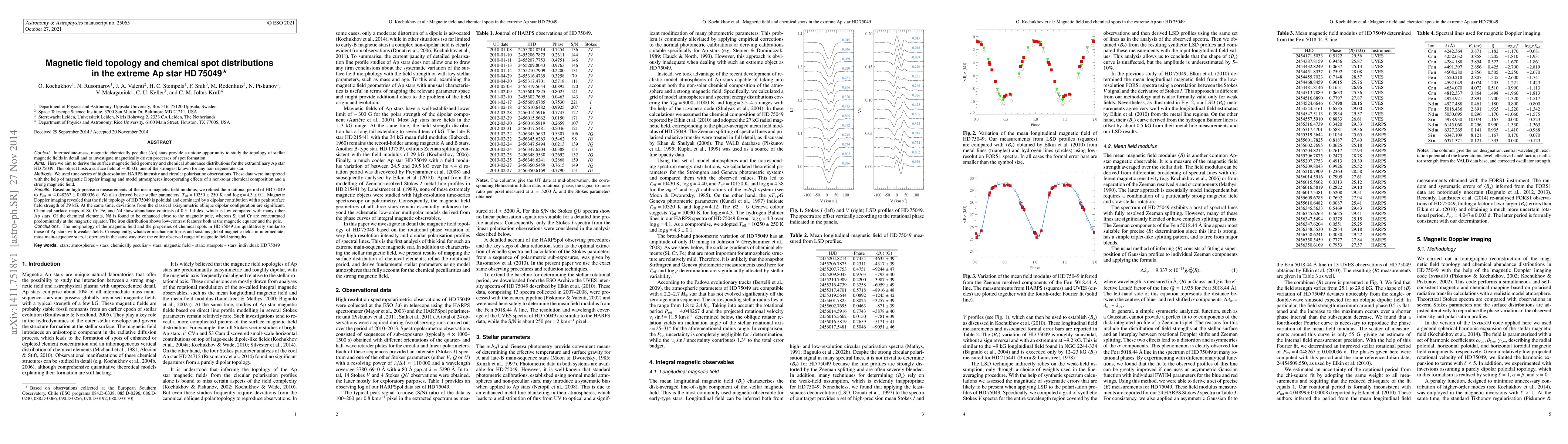 Researchers studied the magnetic field topology and chemical spot distributions of the extreme Ap star HD 75049, finding a strong surface magnetic field with a poloidal configuration and unusual chemical abundance patterns.