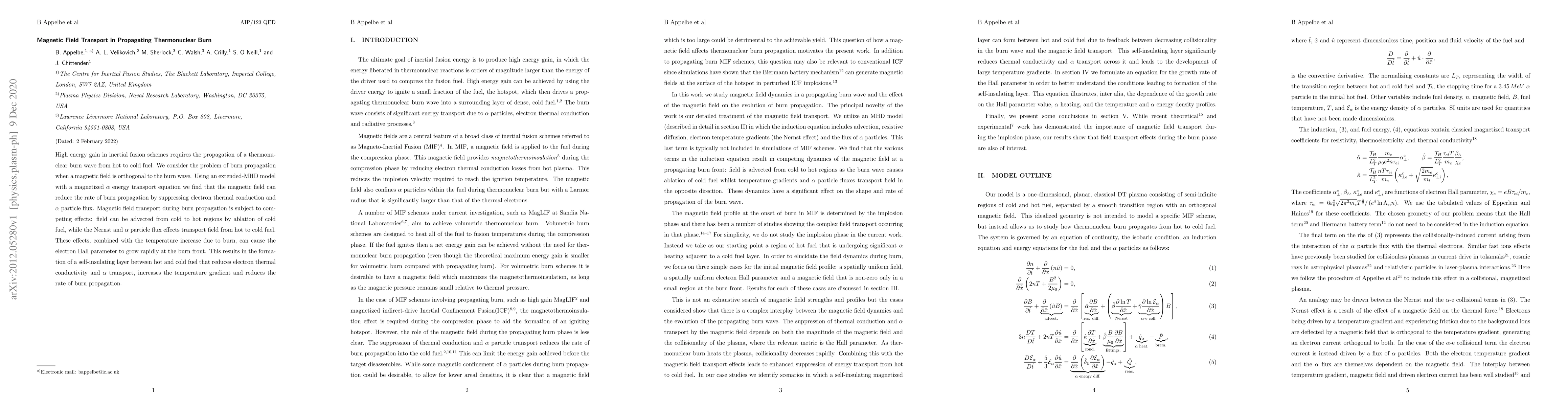 High energy gain in inertial fusion schemes requires the propagation of a thermonuclear burn wave from hot to cold fuel. We consider the problem of burn propagation when a magnetic field is orthogonal to the burn wave. Using an extended-MHD model with a magnetized $\alpha$ energy transport equation we find that the magnetic field can reduce the rate of burn propagation by suppressing electron thermal conduction and $\alpha$ particle flux. Magnetic field transport during burn propagation is subject to competing effects: field can be advected from cold to hot regions by ablation of cold fuel, while the Nernst and $\alpha$ particle flux effects transport field from hot to cold fuel. These effects, combined with the temperature increase due to burn, can cause the electron Hall parameter to grow rapidly at the burn front. This results in the formation of a self-insulating layer between hot and cold fuel that reduces electron thermal conductivity and $\alpha$ transport, increases the temperature gradient and reduces the rate of burn propagation.