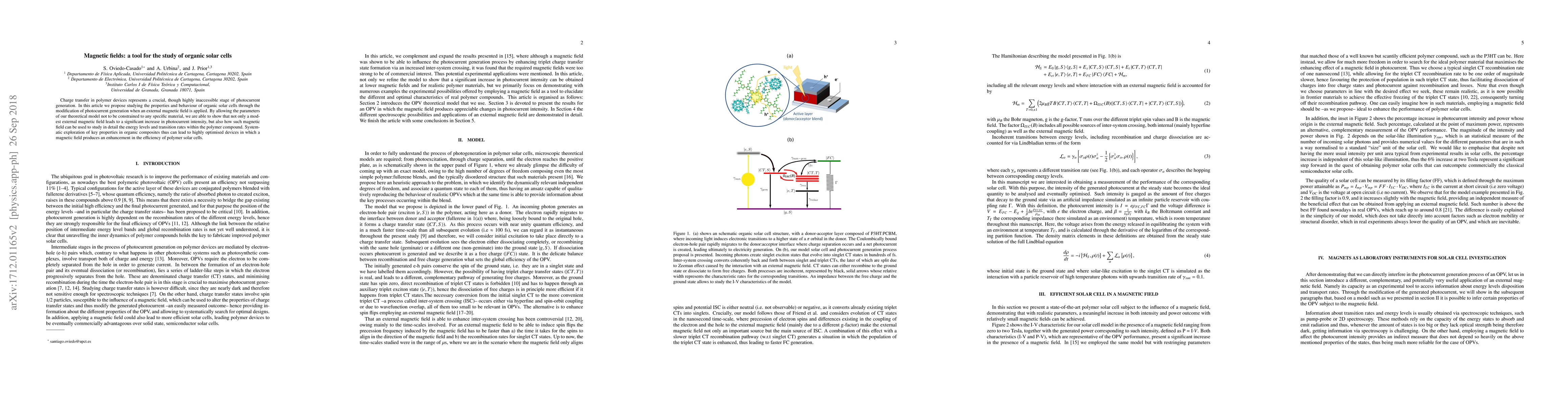 This paper proposes using external magnetic fields to study charge transfer in organic solar cells, demonstrating that modest magnetic fields significantly increase photocurrent intensity and can detail energy levels and transition rates within polymer compounds, potentially leading to highly efficient polymer solar cells.