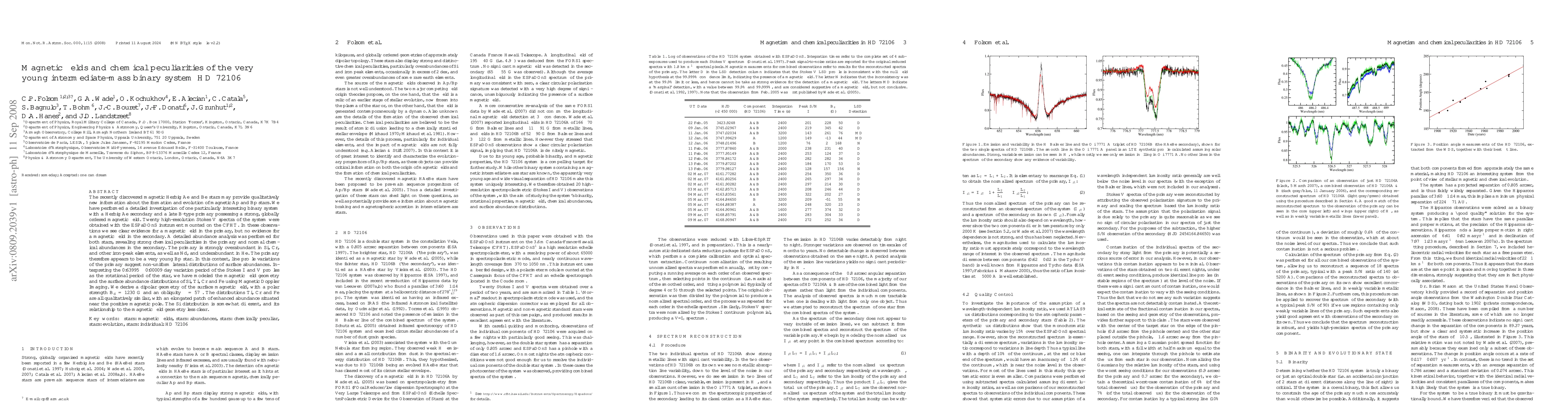The recently discovered magnetic Herbig Ae and Be stars may provide qualitatively new information about the formation and evolution of magnetic Ap and Bp stars. We have performed a detailed investigation of one particularly interesting binary system with a Herbig Ae secondary and a late B-type primary possessing a strong, globally ordered magnetic field. Twenty high-resolution Stokes V spectra of the system were obtained with the ESPaDOnS instrument mounted on the CFHT. In these observations we see clear evidence for a magnetic field in the primary, but no evidence for a magnetic field in the secondary. A detailed abundance analysis was performed for both stars, revealing strong chemical peculiarities in the primary and normal chemical abundances in the secondary. The primary is strongly overabundant in Si, Cr, and other iron-peak elements, as well as Nd, and underabundant in He. The primary therefore appears to be a very young Bp star. In this context, line profile variations of the primary suggest non-uniform lateral distributions of surface abundances. Interpreting the 0.63995 +/- 0.00009 day variation period of the Stokes I and V profiles as the rotational period of the star, we have modeled the magnetic field geometry and the surface abundance distributions of Si, Ti, Cr and Fe using Magnetic Doppler Imaging. We derive a dipolar geometry of the surface magnetic field, with a polar strength of 1230 G and an obliquity of 57 degrees. The distributions Ti, Cr and Fe are all qualitatively similar, with an elongated patch of enhanced abundance situated near the positive magnetic pole. The Si distribution is somewhat different, and its relationship to the magnetic field geometry less clear.