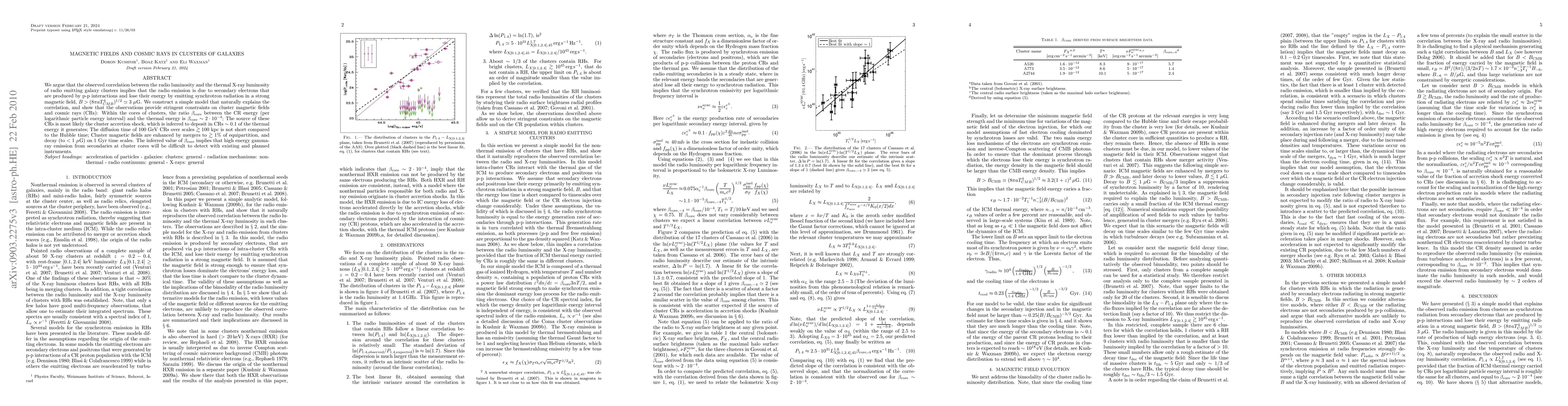 We argue that the observed correlation between the radio luminosity and the X-ray luminosity in radio emitting galaxy clusters implies that the radio emission is due to secondary electrons that are produced by p-p interactions and lose their energy by emitting synchrotron radiation in a strong magnetic field, B>(8\pi a T_{CMB}^4)^{1/2}\simeq 3\muG. We construct a simple model that naturally explains the correlation, and show that the observations provide stringent constraints on cluster magnetic fields and cosmic rays (CRs): Within the cores of clusters, the ratio beta_{core} between the CR energy (per logarithmic particle energy interval) and the thermal energy is beta_{core}\sim 2*10^{-4}; The source of these CRs is most likely the cluster accretion shock, which is inferred to deposit in CRs ~ 0.1 of the thermal energy it generates; The diffusion time of 100 GeV CRs over scales \gtrsim100 kpc is not short compared to the Hubble time; Cluster magnetic fields are enhanced by mergers to \gtrsim 1 % of equipartition, and decay (to <1 muG) on 1 Gyr time scales. The inferred value of beta_{core} implies that high energy gamma-ray emission from secondaries at cluster cores will be difficult to detect with existing and planned instruments.