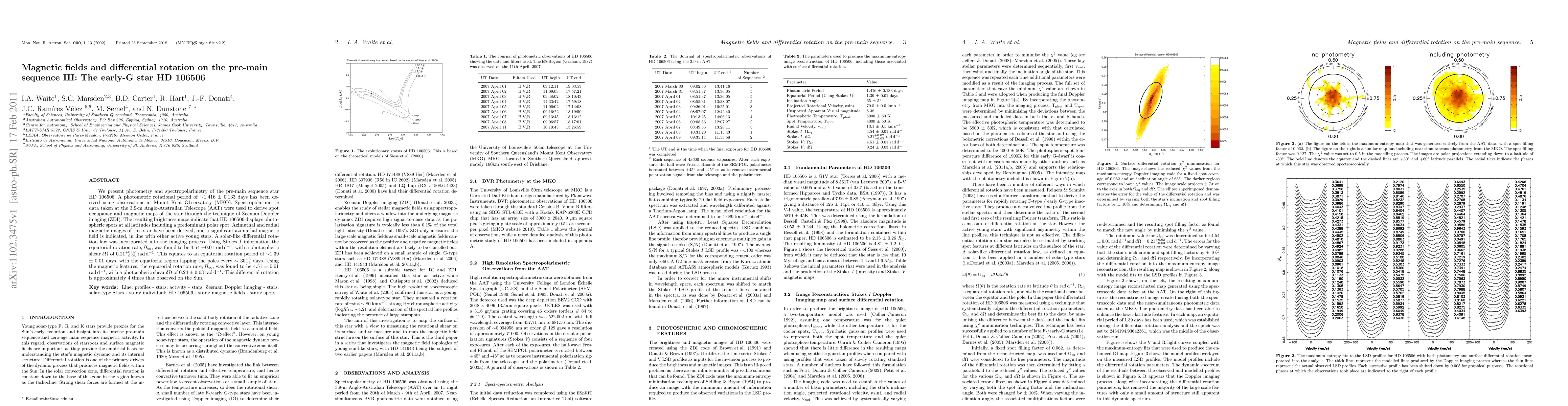 We present photometry and spectropolarimetry of the pre-main sequence star HD 106506. A photometric rotational period of ~1.416 +/- 0.133 days has been derived using observations at Mount Kent Observatory (MKO). Spectropolarimetric data taken at the 3.9-m Anglo-Australian Telescope (AAT) were used to derive spot occupancy and magnetic maps of the star through the technique of Zeeman Doppler imaging (ZDI). The resulting brightness maps indicate that HD 106506 displays photospheric spots at all latitudes including a predominant polar spot. Azimuthal and radial magnetic images of this star have been derived, and a significant azimuthal magnetic field is indicated, in line with other active young stars. A solar-like differential rotation law was incorporated into the imaging process. Using Stokes I information the equatorial rotation rate, $\Omega_{eq}$, was found to be 4.54 +/- 0.01 rad/d, with a photospheric shear $\delta\Omega$ of $0.21_{-0.03}^{+0.02}$ rad/d. This equates to an equatorial rotation period of ~1.39 +/- 0.01 days, with the equatorial region lapping the poles every ~$30_{-3}^{+5}$ days. Using the magnetic features, the equatorial rotation rate, $\Omega_{eq}$, was found to be 4.51 +/- 0.01 rad/d, with a photospheric shear $\delta\Omega$ of 0.24 +/- 0.03 rad/d. This differential rotation is approximately 4 times that observed on the Sun.