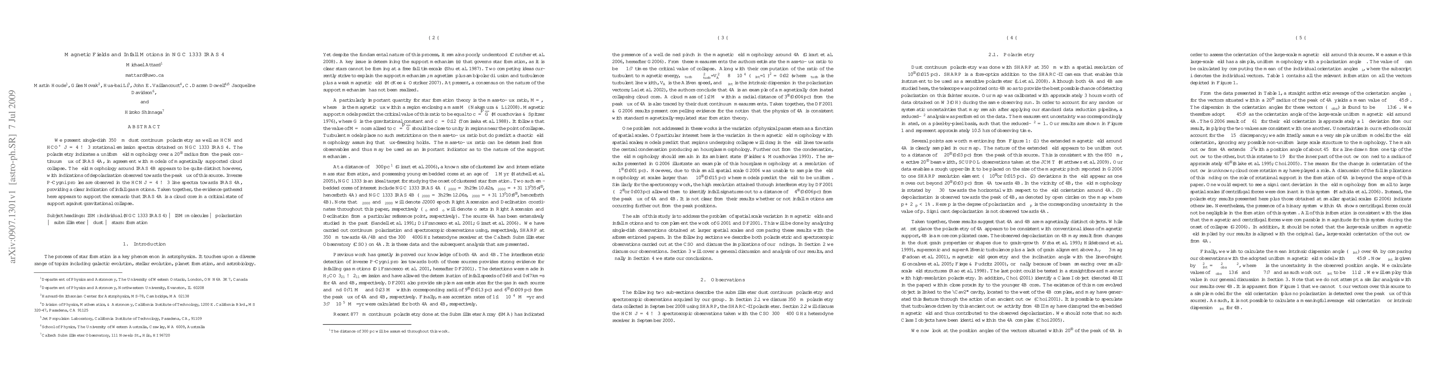 We present single-dish 350 micron dust continuum polarimetry as well as HCN and HCO+ J=4-3 rotational emission spectra obtained on NGC 1333 IRAS 4. The polarimetry indicates a uniform field morphology over a 20" radius from the peak continuum flux of IRAS 4A, in agreement with models of magnetically supported cloud collapse. The field morphology around IRAS 4B appears to be quite distinct however, with indications of depolarization observed towards the peak flux of this source. Inverse P-Cygni profiles are observed in the HCN J=4-3 line spectra towards IRAS 4A, providing a clear indication of infall gas motions. Taken together, the evidence gathered here appears to support the scenario that IRAS 4A is a cloud core in a critical state of support against gravitational collapse.