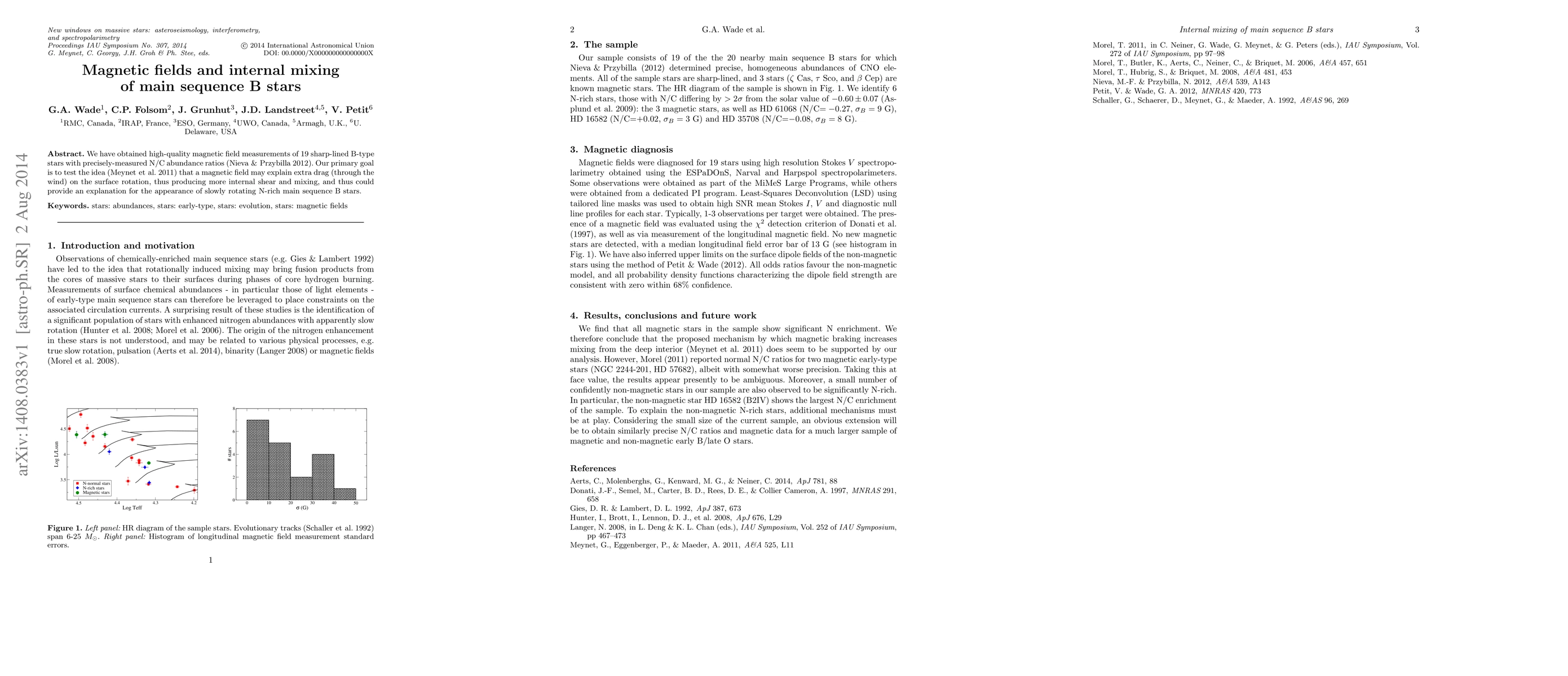 Researchers measured magnetic fields in 19 B-type stars to test if strong magnetic fields can slow surface rotation and increase internal mixing, explaining why some main sequence B stars rotate slowly with high nitrogen content.