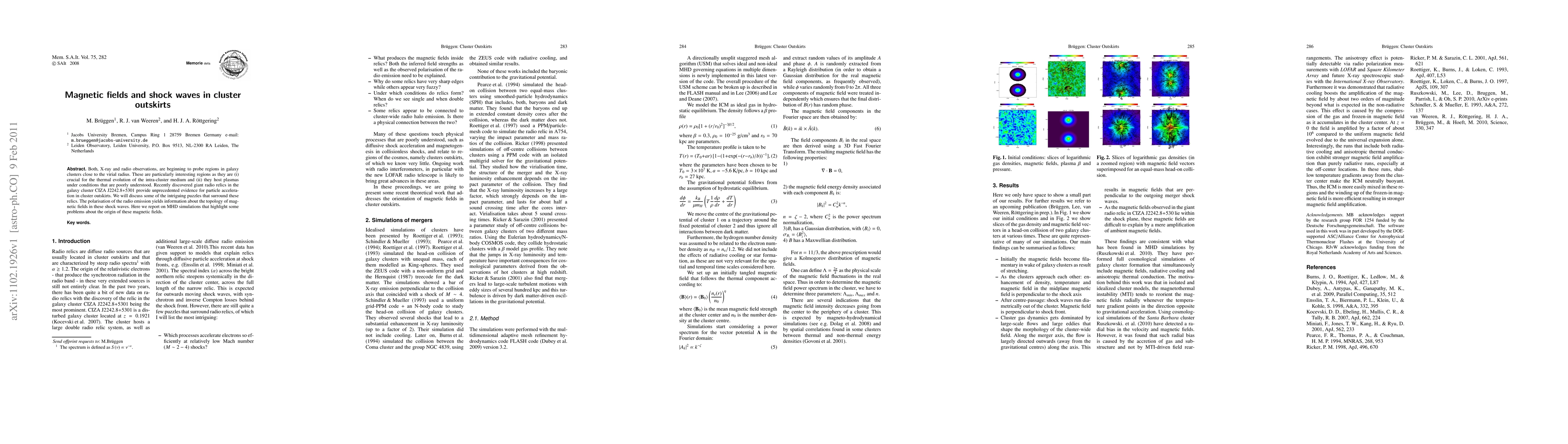 Both, X-ray and radio observations, are beginning to probe regions in galaxy clusters close to the virial radius. These are particularly interesting regions as they are (i) crucial for the thermal evolution of the intra-cluster medium and (ii) they host plasmas under conditions that are poorly understood. Recently discovered giant radio relics in the galaxy cluster CIZA J2242.8+5301 provide unprecedented evidence for particle acceleration in cluster outskirts. We will discuss some of the intriguing puzzles that surround these relics. The polarisation of the radio emission yields information about the topology of magnetic fields in these shock waves. Here we report on MHD simulations that highlight some problems about the origin of these magnetic fields.