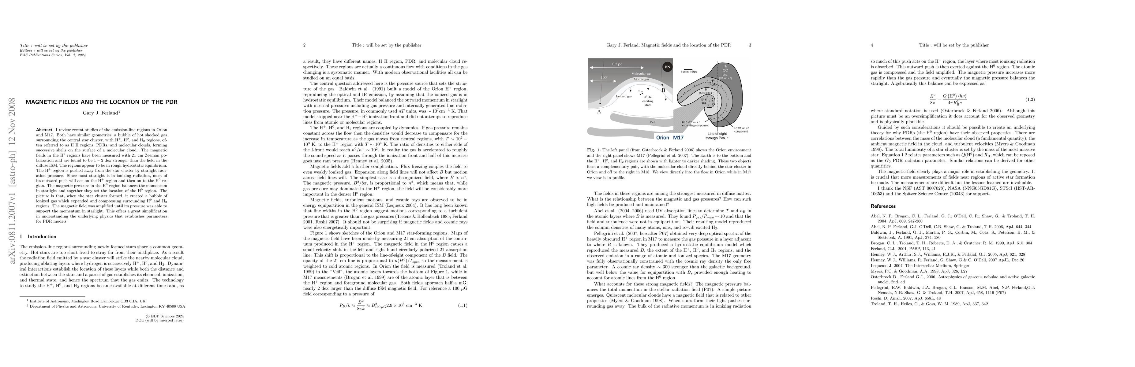 I review recent studies of the emission-line regions in Orion and M17. Both have similar geometries, a bubble of hot shocked gas surrounding the central star cluster, with H^+, H^0, and H_2 regions, often referred to as H II regions, PDRs, and molecular clouds, forming successive shells on the surface of a molecular cloud. The magnetic fields in the H^0 regions have been measured with 21 cm Zeeman polarization and are found to be 1 -- 2 dex stronger than the field in the diffuse ISM. The regions appear to be in rough hydrostatic equilibrium. The H^+ region is pushed away from the star cluster by starlight radiation pressure. Since most starlight is in ionizing radiation, most of its outward push will act on the H^+ region and then on to the H^0 region. The magnetic pressure in the H^0 region balances the momentum in starlight and together they set the location of the H^0 region. The picture is that, when the star cluster formed, it created a bubble of ionized gas which expanded and compressing surrounding H^0 and H_2 regions. The magnetic field was amplified until its pressure was able to support the momentum in starlight. This offers a great simplification in understanding the underlying physics that establishes parameters for PDR models.