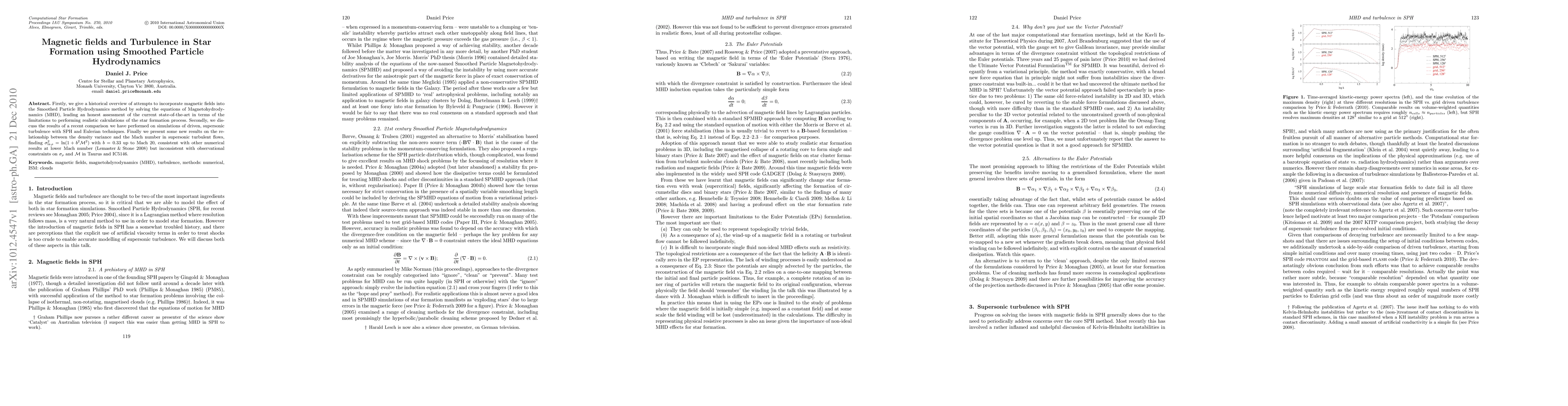 Firstly, we give a historical overview of attempts to incorporate magnetic fields into the Smoothed Particle Hydrodynamics method by solving the equations of Magnetohydrodynamics (MHD), leading an honest assessment of the current state-of-the-art in terms of the limitations to performing realistic calculations of the star formation process. Secondly, we discuss the results of a recent comparison we have performed on simulations of driven, supersonic turbulence with SPH and Eulerian techniques. Finally we present some new results on the relationship between the density variance and the Mach number in supersonic turbulent flows, finding sigma^2_{ln rho} = ln (1 + b^2 M^2) with b=0.33 up to Mach~20, consistent with other numerical results at lower Mach number (Lemaster and Stone 2008) but inconsistent with observational constraints on sigma_rho and M in Taurus and IC5146.