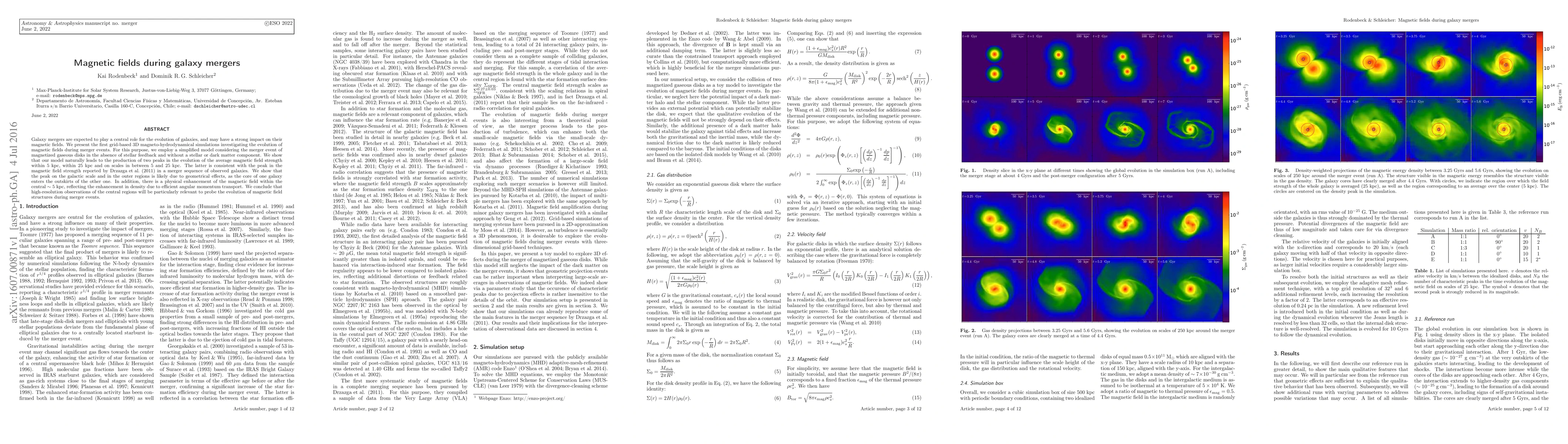 This study uses 3D magneto-hydrodynamical simulations to investigate magnetic field evolution during galaxy mergers, revealing two peaks in magnetic field strength: one in the central ~5 kpc and another in the outer regions. The outer peak is attributed to geometrical effects, while the central peak reflects density enhancements due to angular momentum transport.