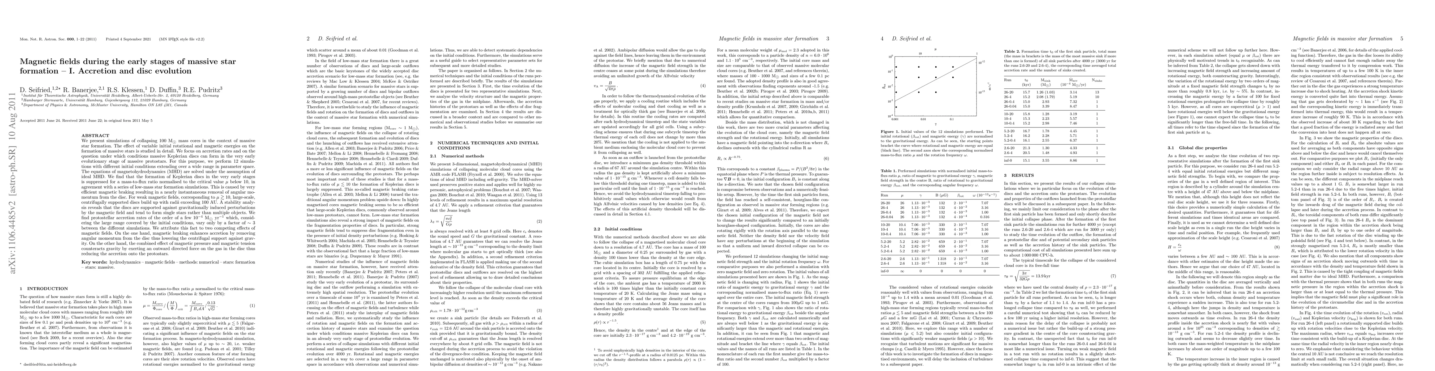 We present simulations of collapsing 100 M_\sun mass cores in the context of massive star formation. The effect of variable initial rotational and magnetic energies on the formation of massive stars is studied in detail. We focus on accretion rates and on the question under which conditions massive Keplerian disks can form in the very early evolutionary stage of massive protostars. For this purpose, we perform 12 simulations with different initial conditions extending over a wide range in parameter space. The equations of magnetohydrodynamics (MHD) are solved under the assumption of ideal MHD. We find that the formation of Keplerian disks in the very early stages is suppressed for a mass-to-flux ratio normalised to the critical value \mu below 10, in agreement with a series of low-mass star formation simulations. This is caused by very efficient magnetic braking resulting in a nearly instantaneous removal of angular momentum from the disk. For weak magnetic fields, corresponding to \mu > 10, large-scale, centrifugally supported disks build up with radii exceeding 100 AU. A stability analysis reveals that the disks are supported against gravitationally induced perturbations by the magnetic field and tend to form single stars rather than multiple objects. We find protostellar accretion rates of the order of a few 10^-4 M_\sun yr^-1 which, considering the large range covered by the initial conditions, vary only by a factor of ~ 3 between the different simulations. We attribute this fact to two competing effects of magnetic fields. On the one hand, magnetic braking enhances accretion by removing angular momentum from the disk thus lowering the centrifugal support against gravity. On the other hand, the combined effect of magnetic pressure and magnetic tension counteracts gravity by exerting an outward directed force on the gas in the disk thus reducing the accretion onto the protostars.