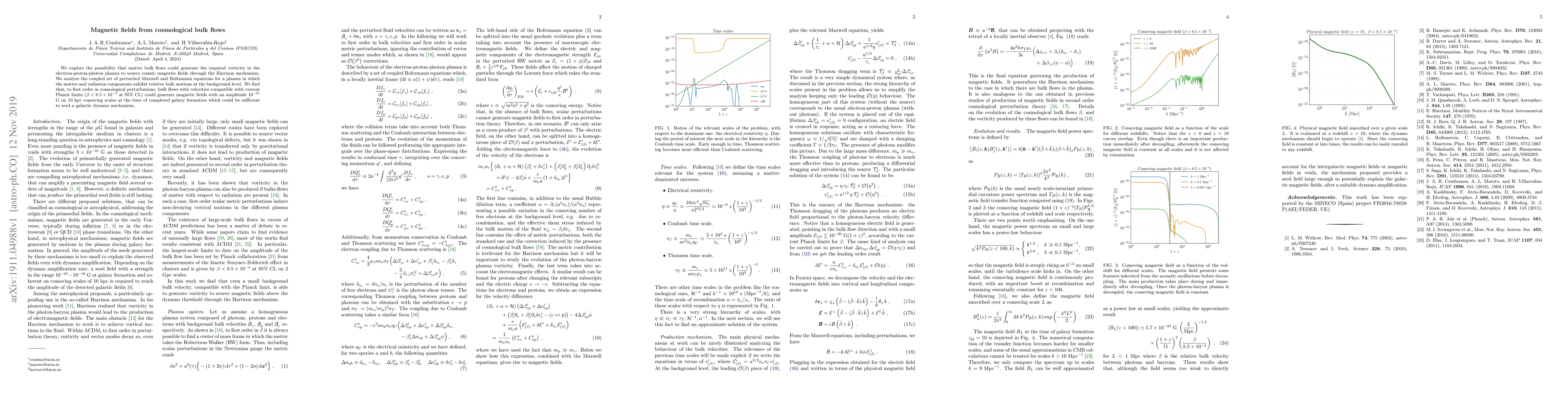 This paper investigates the potential for cosmological bulk flows to generate cosmic magnetic fields via the Harrison mechanism, finding that flows within current observational limits could produce magnetic fields of sufficient strength to seed galactic dynamos. The study uses perturbed Maxwell and Boltzmann equations to model the electron-proton-photon plasma with relative bulk motions.