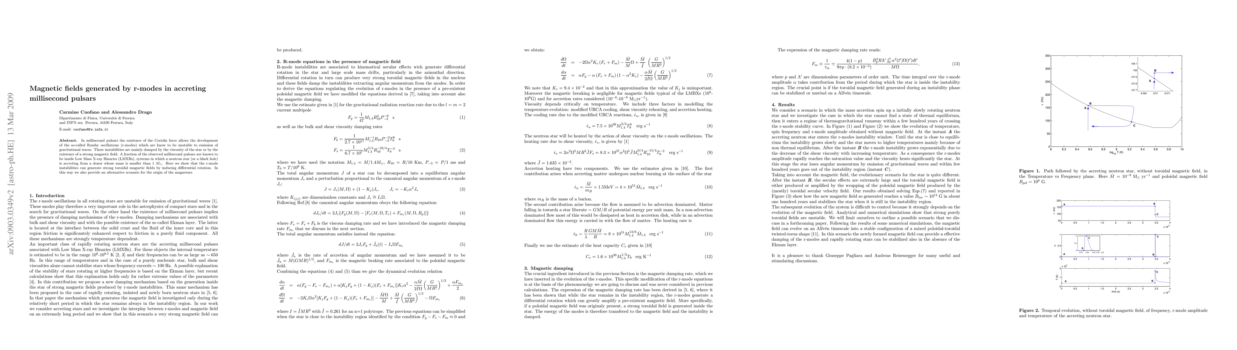 In millisecond pulsars the existence of the Coriolis force allows the development of the so-called Rossby oscillations (r-modes) which are know to be unstable to emission of gravitational waves. These instabilities are mainly damped by the viscosity of the star or by the existence of a strong magnetic field. A fraction of the observed millisecond pulsars are known to be inside Low Mass X-ray Binaries (LMXBs), systems in which a neutron star (or a black hole) is accreting from a donor whose mass is smaller than 1 $M_\odot$. Here we show that the r-mode instabilities can generate strong toroidal magnetic fields by inducing differential rotation. In this way we also provide an alternative scenario for the origin of the magnetars.