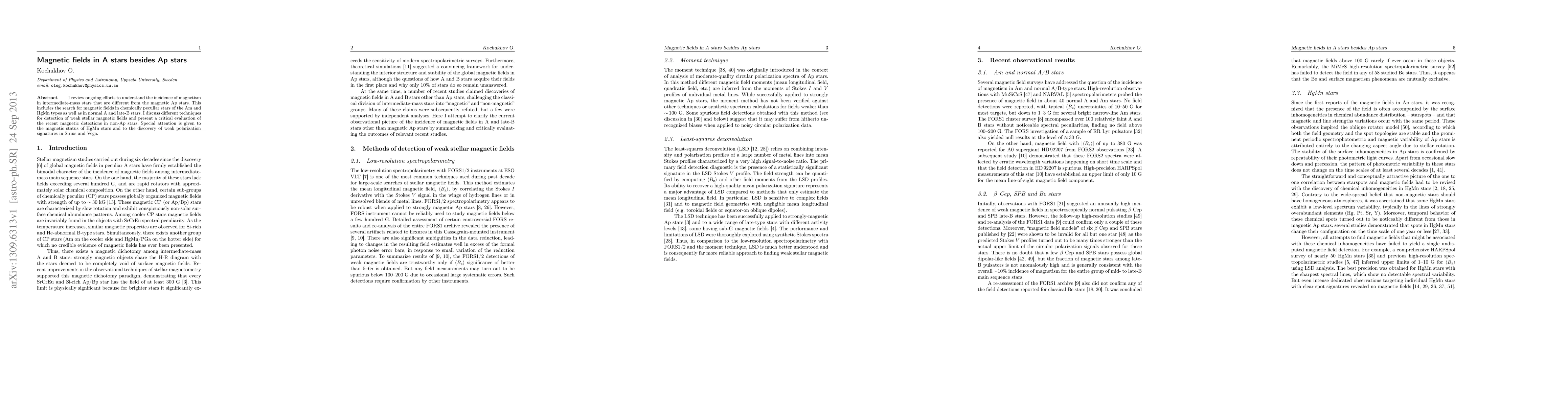 I review ongoing efforts to understand the incidence of magnetism in intermediate-mass stars that are different from the magnetic Ap stars. This includes the search for magnetic fields in chemically peculiar stars of the Am and HgMn types as well as in normal A and late-B stars. I discuss different techniques for detection of weak stellar magnetic fields and present a critical evaluation of the recent magnetic detections in non-Ap stars. Special attention is given to the magnetic status of HgMn stars and to the discovery of weak polarization signatures in Sirius and Vega.