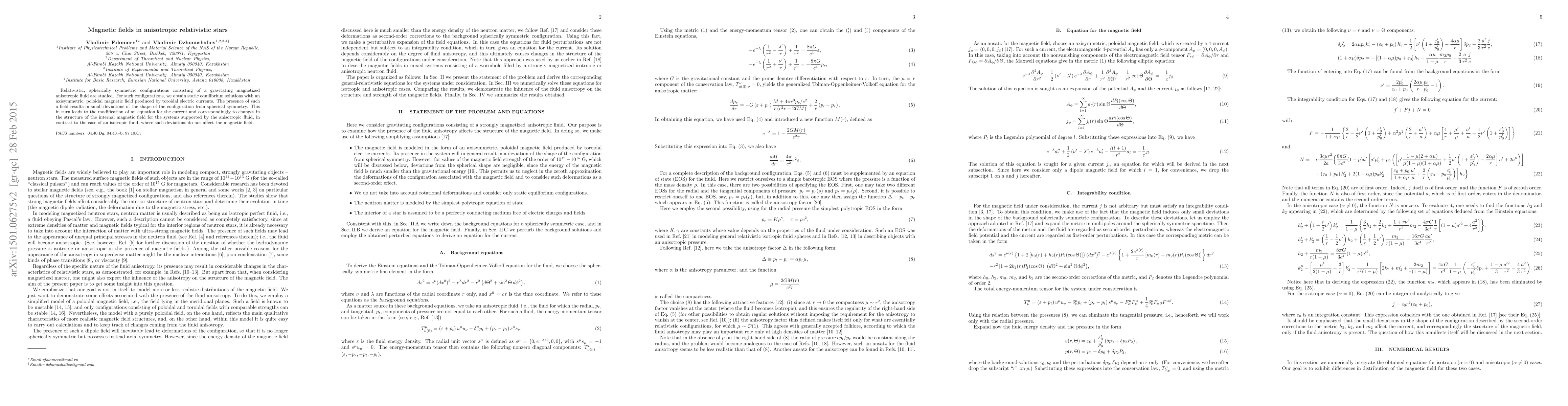 Relativistic, spherically symmetric configurations consisting of a gravitating magnetized anisotropic fluid are studied. For such configurations, we obtain static equilibrium solutions with an axisymmetric, poloidal magnetic field produced by toroidal electric currents. The presence of such a field results in small deviations of the shape of the configuration from spherical symmetry. This in turn leads to the modification of an equation for the current and correspondingly to changes in the structure of the internal magnetic field for the systems supported by the anisotropic fluid, in contrast to the case of an isotropic fluid, where such deviations do not affect the magnetic field.