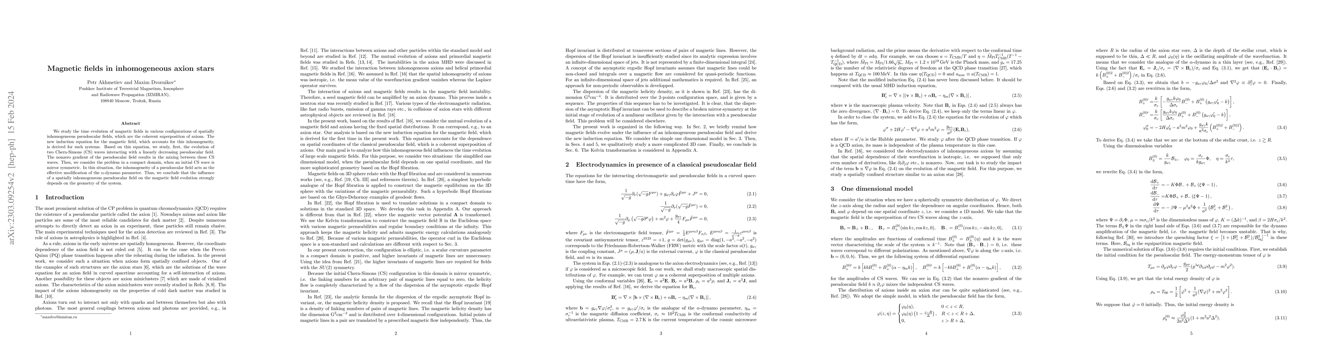 This paper investigates the time evolution of magnetic fields in inhomogeneous axion stars, deriving a new induction equation that accounts for spatial inhomogeneity. It finds that the interaction between Chern-Simons waves in a pseudoscalar field, influenced by its gradient, can modify magnetic field dynamics, highlighting the role of system geometry in magnetic field evolution.