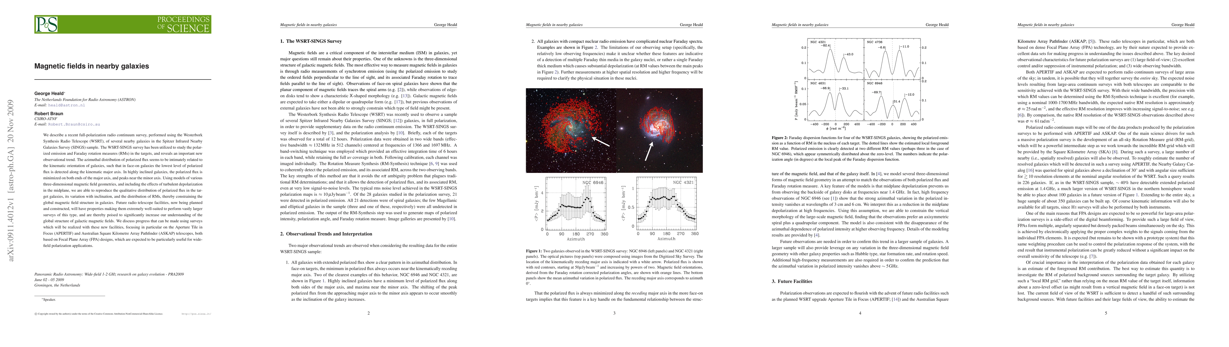 We describe a recent full-polarization radio continuum survey, performed using the Westerbork Synthesis Radio Telescope (WSRT), of several nearby galaxies in the Spitzer Infrared Nearby Galaxies Survey (SINGS) sample. The WSRT-SINGS survey has been utilized to study the polarized emission and Faraday rotation measures (RMs) in the targets, and reveals an important new observational trend. The azimuthal distribution of polarized flux seems to be intimately related to the kinematic orientation of galaxies, such that in face-on galaxies the lowest level of polarized flux is detected along the kinematic major axis. In highly inclined galaxies, the polarized flux is minimized on both ends of the major axis, and peaks near the minor axis. Using models of various three-dimensional magnetic field geometries, and including the effects of turbulent depolarization in the midplane, we are able to reproduce the qualitative distribution of polarized flux in the target galaxies, its variation with inclination, and the distribution of RMs, thereby constraining the global magnetic field structure in galaxies. Future radio telescope facilities, now being planned and constructed, will have properties making them extremely well-suited to perform vastly larger surveys of this type, and are thereby poised to significantly increase our understanding of the global structure of galactic magnetic fields. We discuss progress that can be made using surveys which will be realized with these new facilities, focusing in particular on the Aperture Tile in Focus (APERTIF) and Australian Square Kilometre Array Pathfinder (ASKAP) telescopes, both based on Focal Plane Array (FPA) designs, which are expected to be particularly useful for wide-field polarization applications.