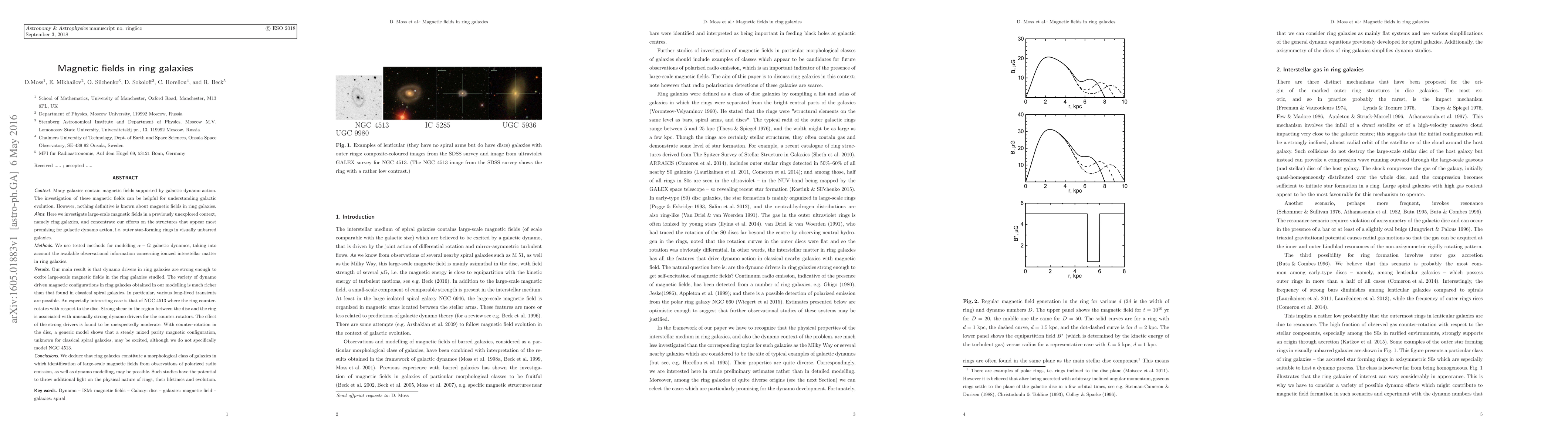 This study investigates magnetic fields in ring galaxies, finding strong dynamo drivers that excite large-scale magnetic fields, with some unexpected configurations such as counter-rotation.