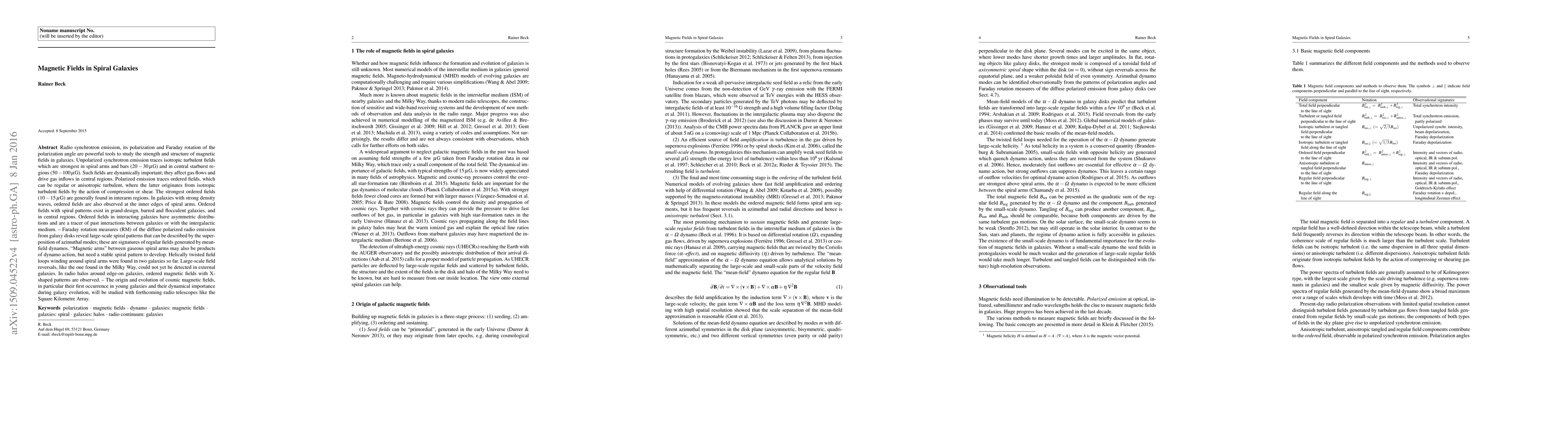This paper explores the magnetic fields in spiral galaxies using radio synchrotron emission, revealing that isotropic turbulent fields are strongest in spiral arms and starburst regions, while ordered fields are prominent in interarm regions and influenced by density waves. The study also highlights the role of mean-field dynamos in generating large-scale spiral patterns in magnetic fields.