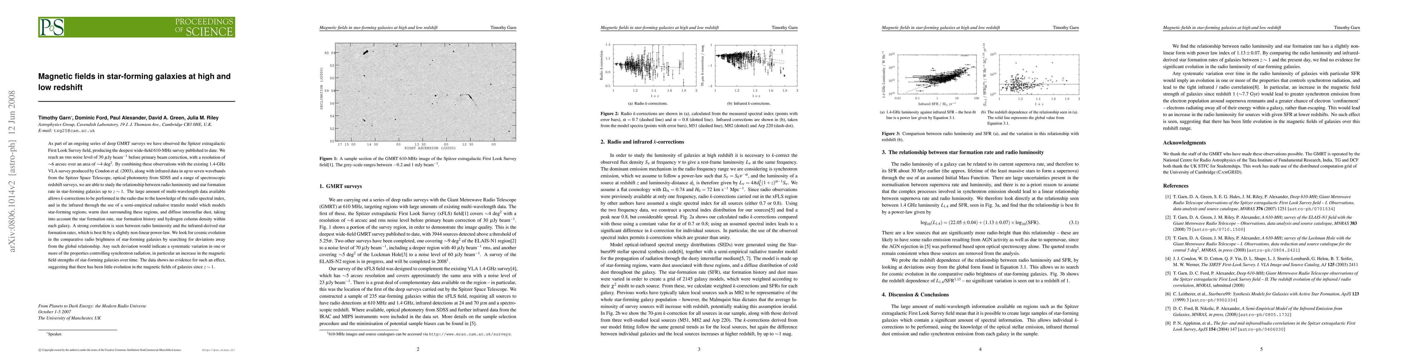 As part of an ongoing series of deep GMRT surveys we have observed the Spitzer extragalactic First Look Survey field, producing the deepest wide-field 610-MHz survey published to date. We reach an rms noise of 30 microJy/beam before primary beam correction, with a resolution of ~6 arcsec over an area of ~4 square degrees. By combining these observations with the existing 1.4-GHz VLA survey produced by Condon et al. (2003), along with infrared data in up to seven wavebands from the Spitzer Space Telescope, optical photometry from SDSS and a range of spectroscopic redshift surveys, we are able to study the relationship between radio luminosity and star formation rate in star-forming galaxies up to z ~ 1. The large amount of multi-wavelength data available allows accurate k-corrections to be performed in the radio due to the knowledge of the radio spectral index, and in the infrared through the use of a semi-empirical radiative transfer model which models star-forming regions, warm dust surrounding these regions, and diffuse interstellar dust, taking into account the star formation rate, star formation history and hydrogen column density within each galaxy. A strong correlation is seen between radio luminosity and infrared-derived star formation rates, which is best fit by a slightly non-linear power-law. We look for cosmic evolution in the comparative radio brightness of star-forming galaxies by searching for deviations away from the global relationship. Any such deviation would indicate a systematic variation in one or more of the properties controlling synchrotron radiation, in particular an increase in the magnetic field strengths of star-forming galaxies. The data shows no evidence for such an effect, suggesting that there has been little evolution in the magnetic fields of galaxies since z ~ 1.