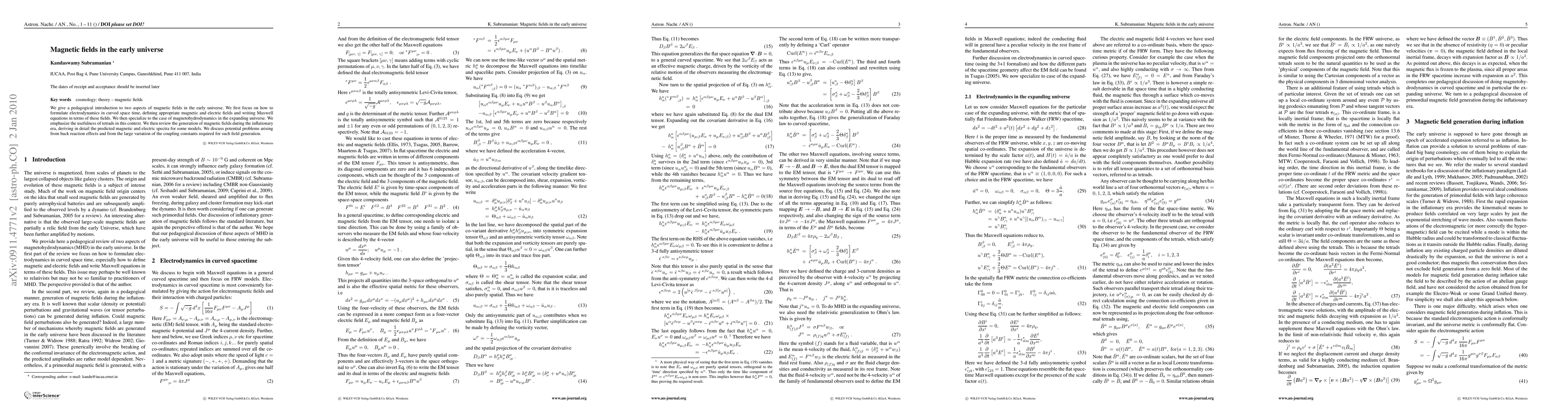 We give a pedagogical introduction to two aspects of magnetic fields in the early universe. We first focus on how to formulate electrodynamics in curved space time, defining appropriate magnetic and electric fields and writing Maxwell equations in terms of these fields. We then specialize to the case of magnetohydrodynamics in the expanding universe. We emphasize the usefulness of tetrads in this context. We then review the generation of magnetic fields during the inflationary era, deriving in detail the predicted magnetic and electric spectra for some models. We discuss potential problems arising from back reaction effects and from the large variation of the coupling constants required for such field generation.