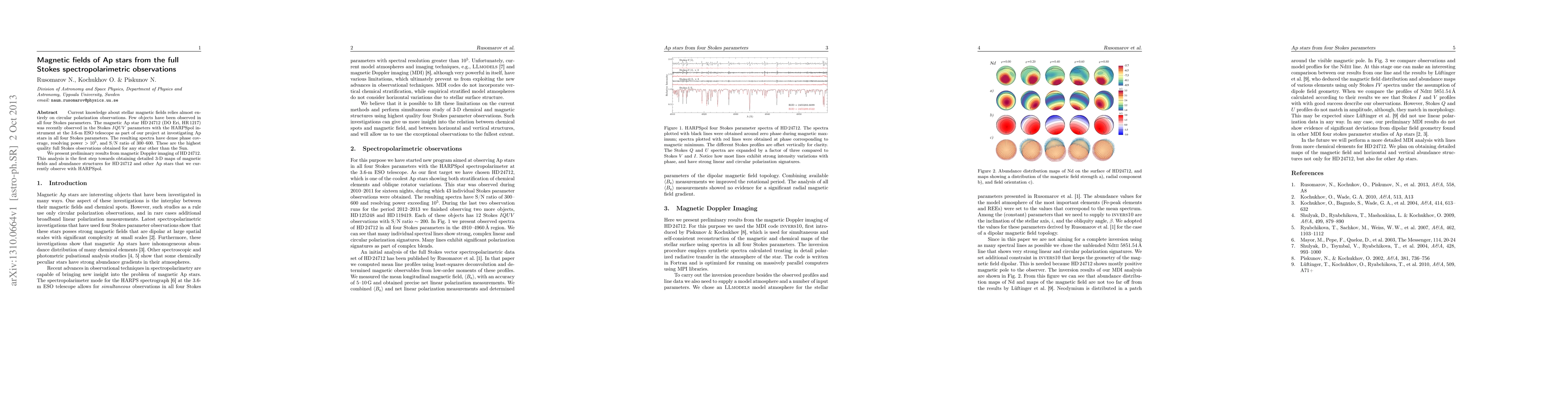 Current knowledge about stellar magnetic fields relies almost entirely on circular polarization observations. Few objects have been observed in all four Stokes parameters. The magnetic Ap star HD 24712 (DO Eri, HR 1217) was recently observed in the Stokes IQUV parameters with the HARPSpol instrument at the 3.6-m ESO telescope as part of our project at investigating Ap stars in all four Stokes parameters. The resulting spectra have dense phase coverage, resolving power > 10^5, and S/N ratio of 300-600. These are the highest quality full Stokes observations obtained for any star other than the Sun. We present preliminary results from magnetic Doppler imaging of HD 24712. This analysis is the first step towards obtaining detailed 3-D maps of magnetic fields and abundance structures for HD 24712 and other Ap stars that we currently observe with HARPSpol.