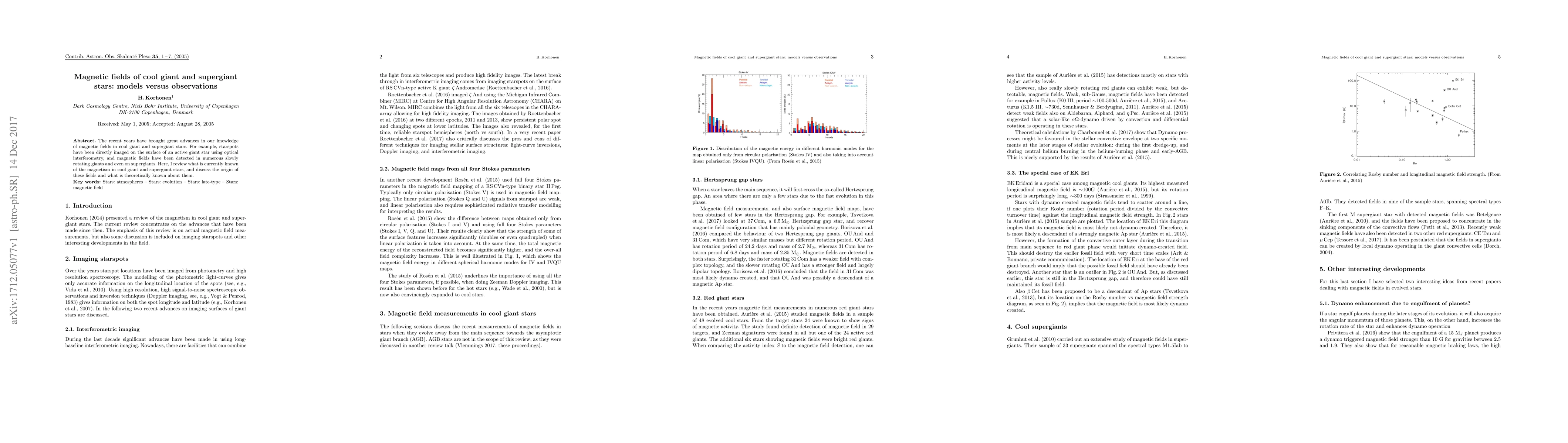 This paper reviews recent advances in understanding magnetic fields in cool giant and supergiant stars, highlighting direct imaging of starspots and detection of magnetic fields, and discusses the theoretical origins of these magnetic phenomena.