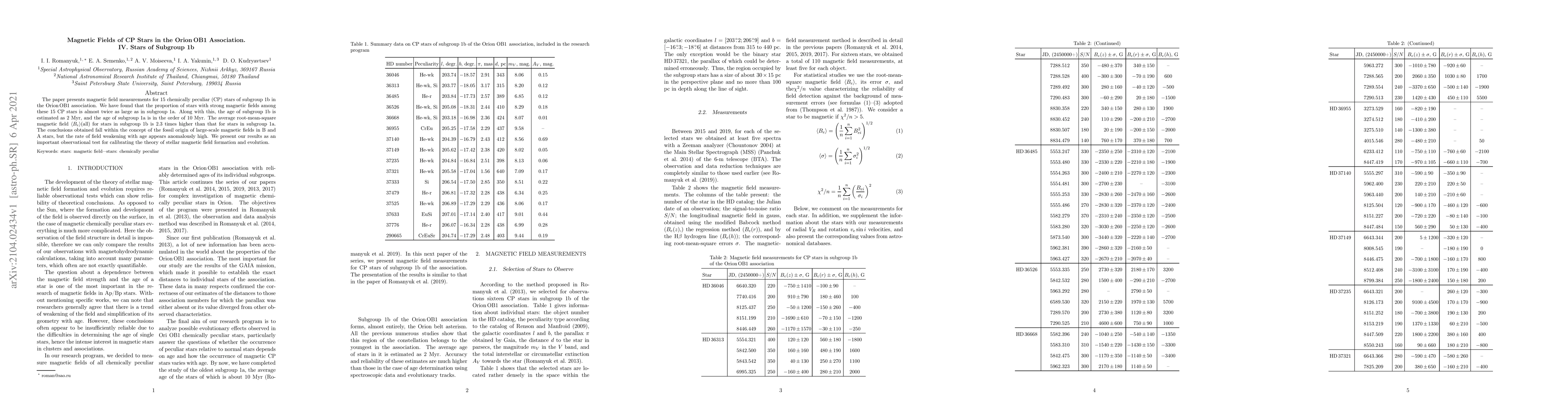 Research on 15 chemically peculiar stars in the OrionOB1 association reveals that subgroup 1b has stronger magnetic fields than subgroup 1a, with ages estimated at 2 Myr and 10 Myr respectively.