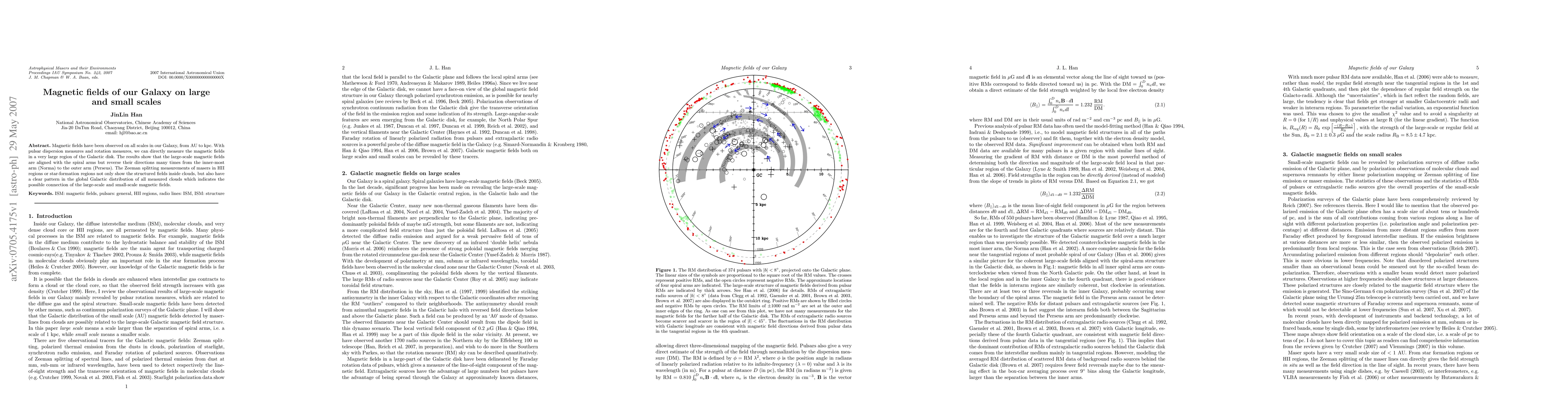 Magnetic fields have been observed on all scales in our Galaxy, from AU to kpc. With pulsar dispersion measures and rotation measures, we can directly measure the magnetic fields in a very large region of the Galactic disk. The results show that the large-scale magnetic fields are aligned with the spiral arms but reverse their directions many times from the inner-most arm (Norma) to the outer arm (Perseus). The Zeeman splitting measurements of masers in HII regions or star-formation regions not only show the structured fields inside clouds, but also have a clear pattern in the global Galactic distribution of all measured clouds which indicates the possible connection of the large-scale and small-scale magnetic fields.