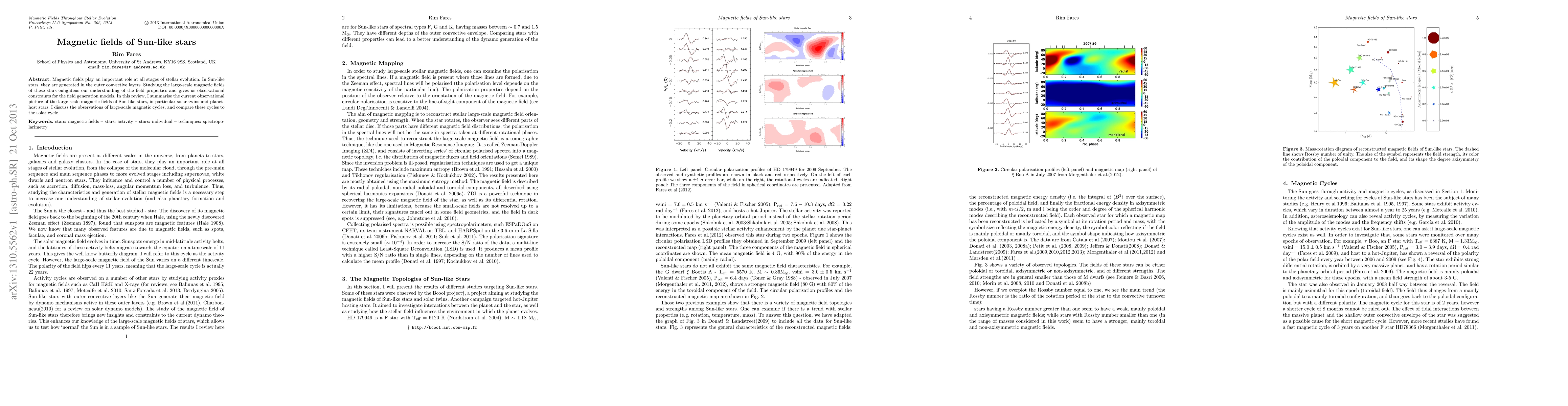 This review examines large-scale magnetic fields of Sun-like stars, highlighting their properties and comparing solar cycles to those found in stellar twins and planet-host stars.