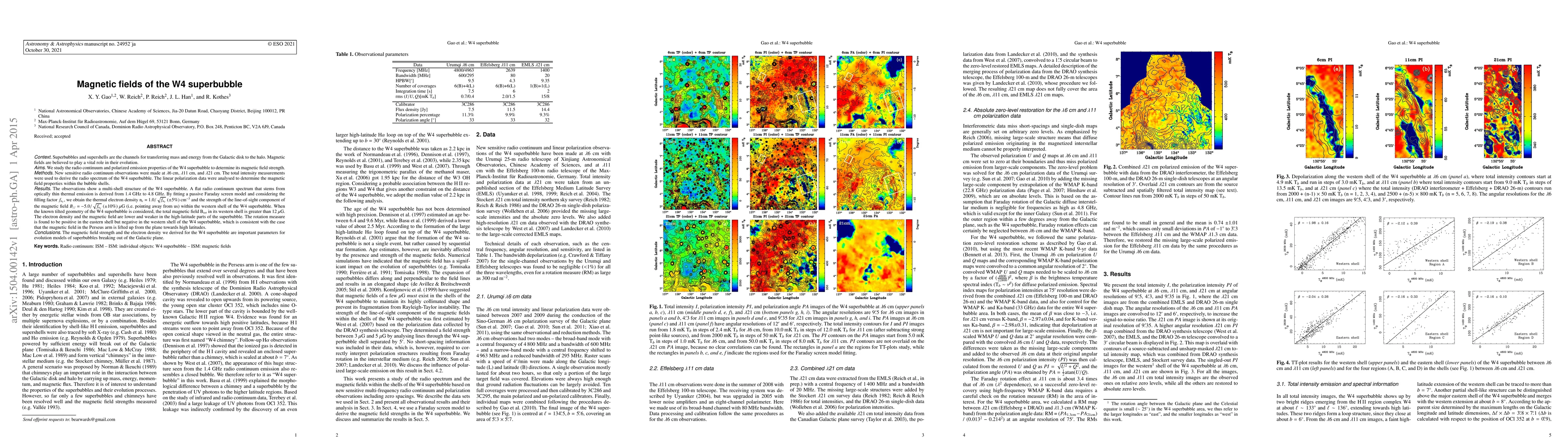 The paper presents a detailed analysis of the W4 superbubble's magnetic field using advanced radio continuum and polarization observations, leading to precise measurements of electron density and magnetic field strength.