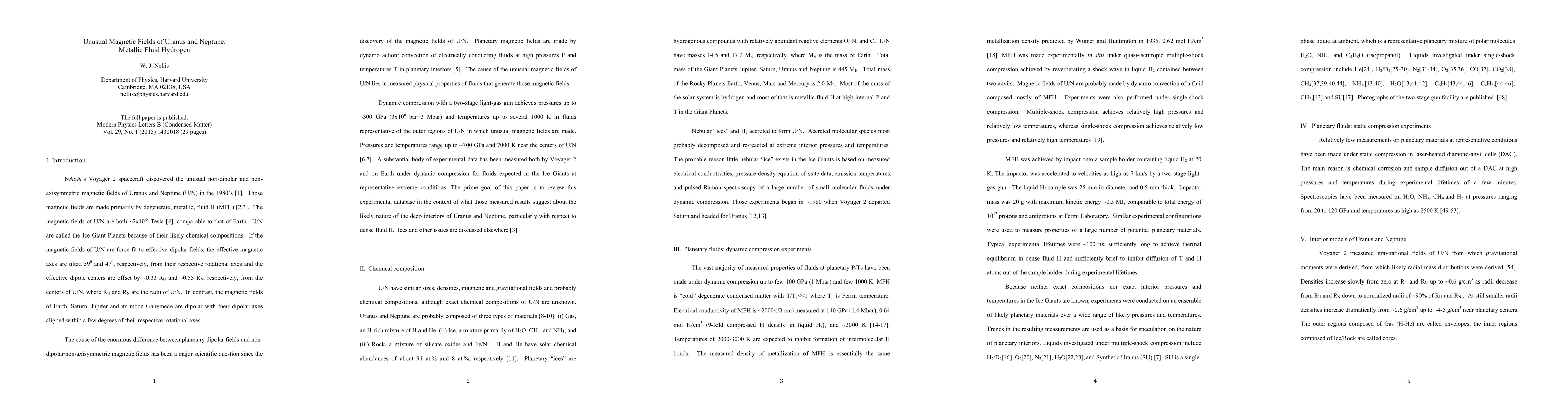 The magnetic fields of the Ice Giant Planets Uranus and Neptune (U/N) are unique in the solar system. Based on a substantial database measured on Earth for representative planetary fluids at representative dynamic pressures up to 200 GPa (2 Mbar) and a few 1000 K, the complex magnetic fields of U/N are (i) probably made primarily by degenerate metallic fluid H (MFH) at or near the crossover from the H-He envelopes to Ice cores at ~100 GPa (Mbar) pressures and normalized radii of ~90% of the radii of U/N; (ii) because those magnetic fields are made relatively close to the surfaces of U/N, non-dipolar fields can be expected; (iii) the Ice cores are most probably a heterogeneous fluid mixture of H, N, O, C, Fe/Ni and silicate-oxides and their mutual reaction products at high pressures and temperatures,as discussed elsewhere. Ironically, there is probably little nebular Ice in the Ice Giant Planets.