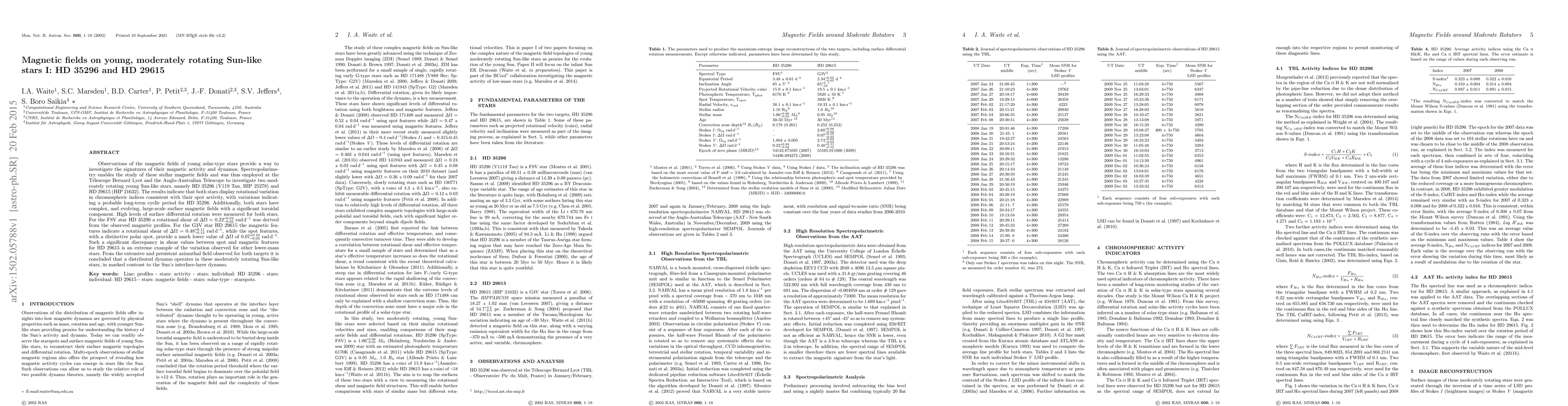 Observations of the magnetic fields of young solar-type stars provide a way to investigate the signatures of their magnetic activity and dynamos. Spectropolarimetry enables the study of these stellar magnetic fields and was thus employed at the T\'{e}lescope Bernard Lyot and the Anglo-Australian Telescope to investigate two moderately rotating young Sun-like stars, namely HD 35296 (V119 Tau, HIP 25278) and HD 29615 (HIP 21632). The results indicate that both stars display rotational variation in chromospheric indices consistent with their spot activity, with variations indicating a probable long-term cyclic period for HD 35296. Additionally, both stars have complex, and evolving, large-scale surface magnetic fields with a significant toroidal component. High levels of surface differential rotation were measured for both stars. For the F8V star HD 35296 a rotational shear of $\Delta\Omega$ = 0.22$^{+0.04}_{-0.02}$ rad/d was derived from the observed magnetic profiles. For the G3V star HD 29615 the magnetic features indicate a rotational shear of $\Delta\Omega$ = 0.48$_{-0.12}^{+0.11}$ rad/d, while the spot features, with a distinctive polar spot, provide a much lower value of $\Delta\Omega$ of 0.07$_{-0.03}^{+0.10}$ rad/d. Such a significant discrepancy in shear values between spot and magnetic features for HD 29615 is an extreme example of the variation observed for other lower-mass stars. From the extensive and persistent azimuthal field observed for both targets it is concluded that a distributed dynamo operates in these moderately rotating Sun-like stars, in marked contrast to the Sun's interface-layer dynamo.