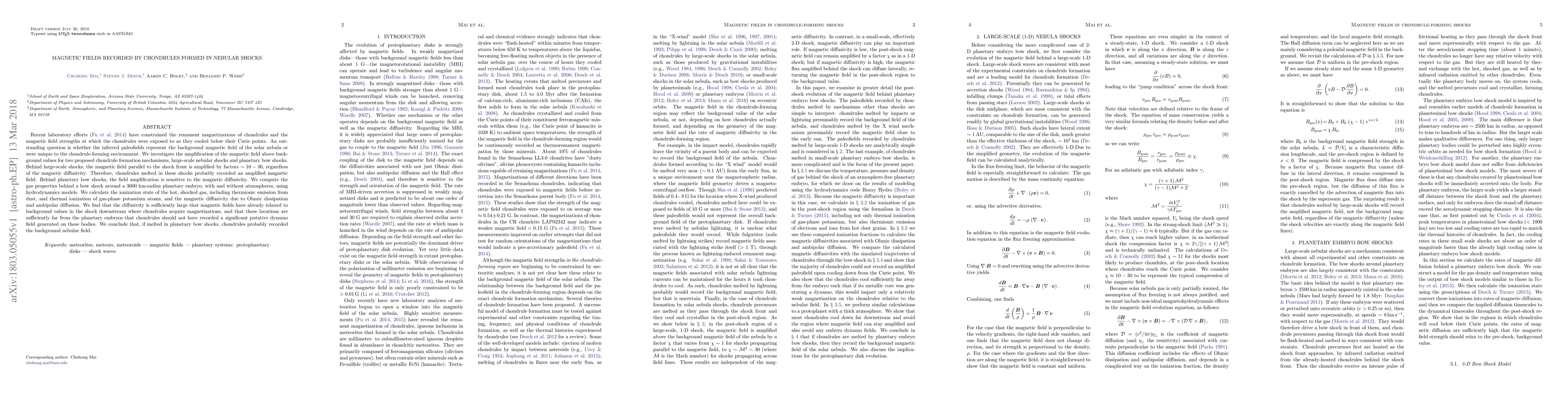 This paper investigates magnetic field amplification in nebular shocks and planetary bow shocks, determining that chondrules formed in nebular shocks likely recorded amplified magnetic fields, while those formed in planetary bow shocks likely recorded the background nebular magnetic field.
