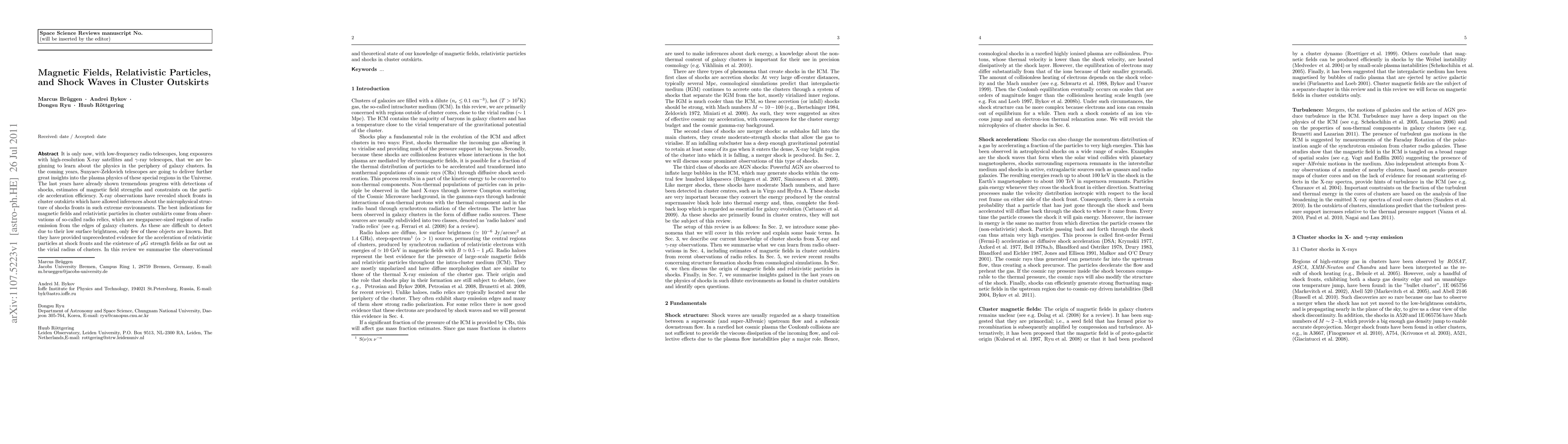 This paper reviews recent advancements in understanding the physics of galaxy cluster outskirts, focusing on magnetic fields, relativistic particles, and shock waves. Observations using advanced telescopes have revealed shock fronts, magnetic field strengths, and particle acceleration efficiencies, with radio relics providing key evidence for these phenomena.