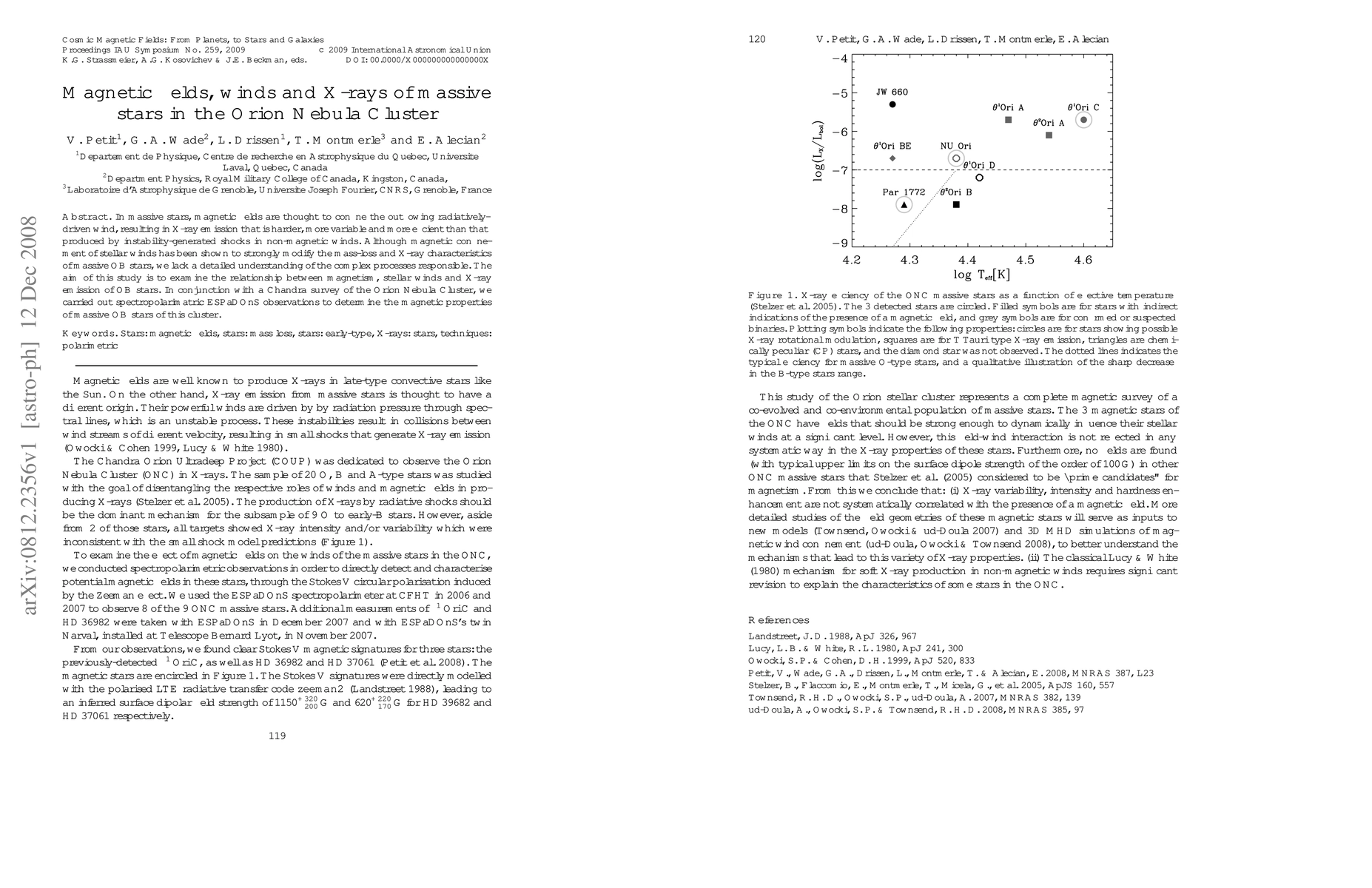In massive stars, magnetic fields are thought to confine the outflowing radiatively-driven wind, resulting in X-ray emission that is harder, more variable and more efficient than that produced by instability-generated shocks in non-magnetic winds. Although magnetic confinement of stellar winds has been shown to strongly modify the mass-loss and X-ray characteristics of massive OB stars, we lack a detailed understanding of the complex processes responsible. The aim of this study is to examine the relationship between magnetism, stellar winds and X-ray emission of OB stars. In conjunction with a Chandra survey of the Orion Nebula Cluster, we carried out spectropolarimatric ESPaDOnS observations to determine the magnetic properties of massive OB stars of this cluster.