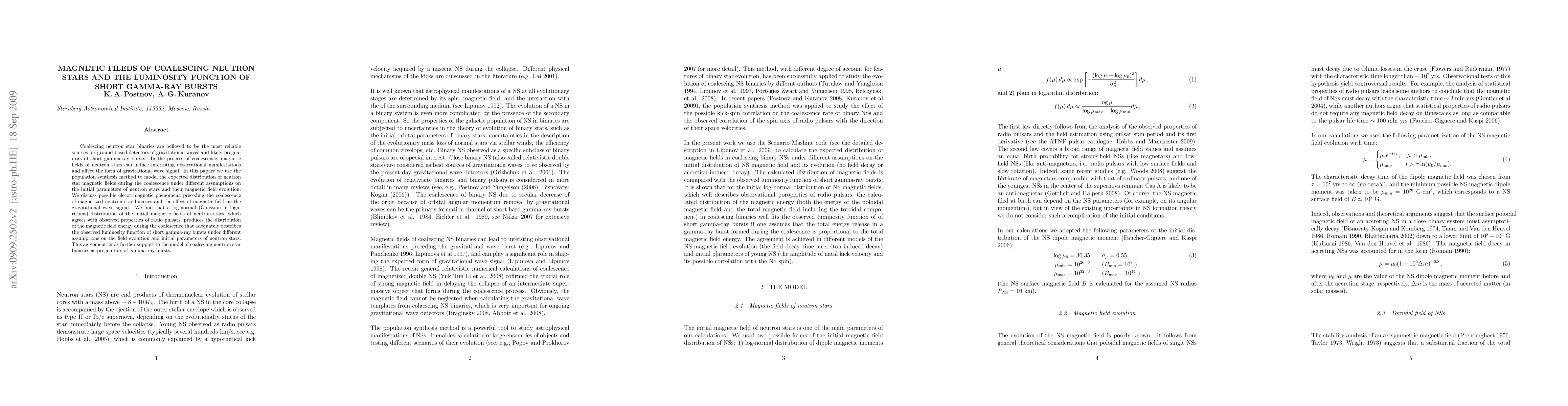 This paper models the magnetic fields of coalescing neutron stars and finds that a log-normal distribution of initial magnetic fields aligns with the observed luminosity function of short gamma-ray bursts, supporting the theory that neutron star mergers are the progenitors of these bursts.