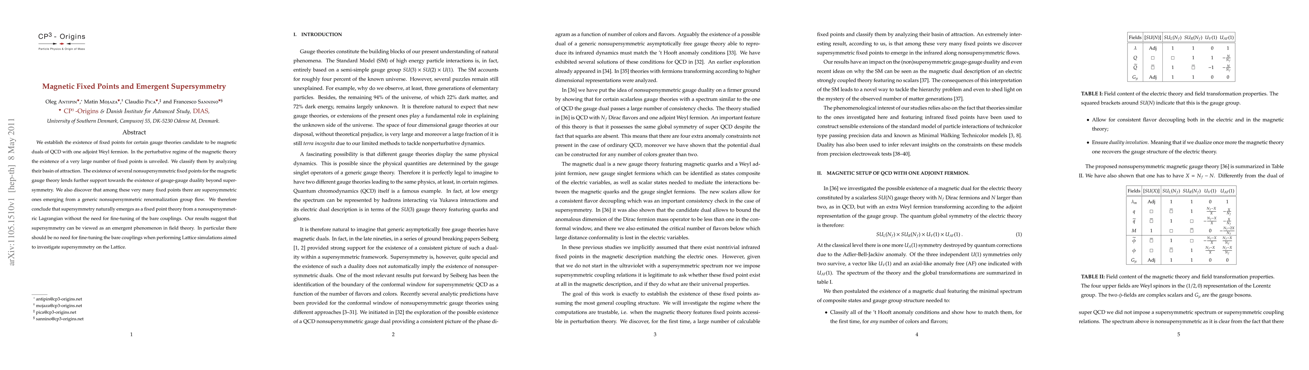 We establish the existence of fixed points for certain gauge theories candidate to be magnetic duals of QCD with one adjoint Weyl fermion. In the perturbative regime of the magnetic theory the existence of a very large number of fixed points is unveiled. We classify them by analyzing their basin of attraction. The existence of several nonsupersymmetric fixed points for the magnetic gauge theory lends further support towards the existence of gauge-gauge duality beyond supersymmetry. We also discover that among these very many fixed points there are supersymmetric ones emerging from a generic nonsupersymmetric renormalization group flow. We therefore conclude that supersymmetry naturally emerges as a fixed point theory from a nonsupersymmetric Lagrangian without the need for fine-tuning of the bare couplings. Our results suggest that supersymmetry can be viewed as an emergent phenomenon in field theory. In particular there should be no need for fine-tuning the bare couplings when performing Lattice simulations aimed to investigate supersymmetry on the Lattice.