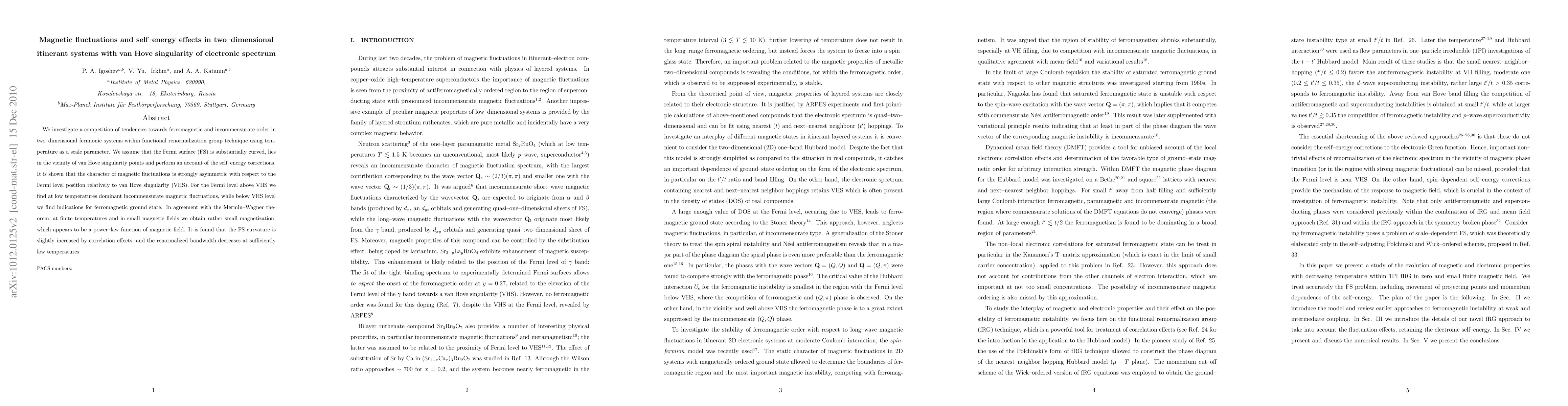 We investigate a competition of tendencies towards ferromagnetic and incommensurate order in two-dimensional fermionic systems within functional renormalization group technique using temperature as a scale parameter. We assume that the Fermi surface (FS) is substantially curved, lies in the vicinity of van Hove singularity points and perform an account of the self-energy corrections. It is shown that the character of magnetic fluctuations is strongly asymmetric with respect to the Fermi level position relatively to van Hove singularity (VHS). For the Fermi level above VHS we find at low temperatures dominant incommensurate magnetic fluctuations, while below VHS level we find indications for ferromagnetic ground state. In agreement with the Mermin-Wagner theorem, at finite temperatures and in small magnetic fields we obtain rather small magnetization, which appears to be a power-law function of magnetic field. It is found that the FS curvature is slightly increased by correlation effects, and the renormalized bandwidth decreases at sufficiently low temperatures.