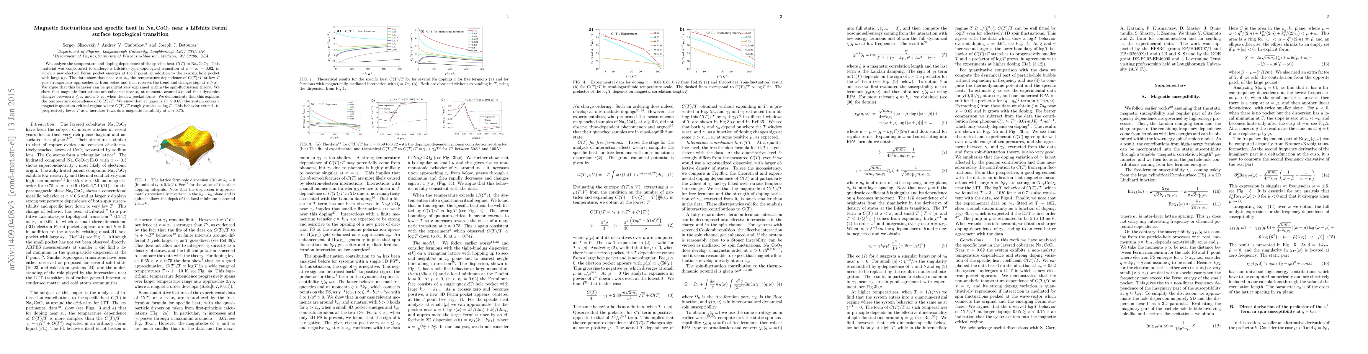 We analyze the temperature and doping dependence of the specific heat $C(T)$ in Na$_x$CoO$_2$. This material was conjectured to undergo a Lifshitz -type topological transition at $x =x_c =0.62$, in which a new electron Fermi pocket emerges at the $\Gamma$ point, in addition to the existing hole pocket with large $k_F$. The data show that near $x =x_c$, the temperature dependence of $C(T)/T$ at low $T$ gets stronger as $x$ approaches $x_c$ from below and then reverses the trend and changes sign at $x \geq x_c$. We argue that this behavior can be quantitatively explained within the spin-fluctuation theory. We show that magnetic fluctuations are enhanced near $x_c$ at momenta around $k_F$ and their dynamics changes between $x \leq x_c$ and $x >x_c$, when the new pocket forms. We demonstrate that this explains the temperature dependence of $C(T)/T$. We show that at larger $x$ ($x > 0.65$) the system enters a magnetic quantum critical regime where $C(T)/T$ roughly scales as $\log T$. This behavior extends to progressively lower $T$ as $x$ increases towards a magnetic instability at $x \approx 0.75$.
