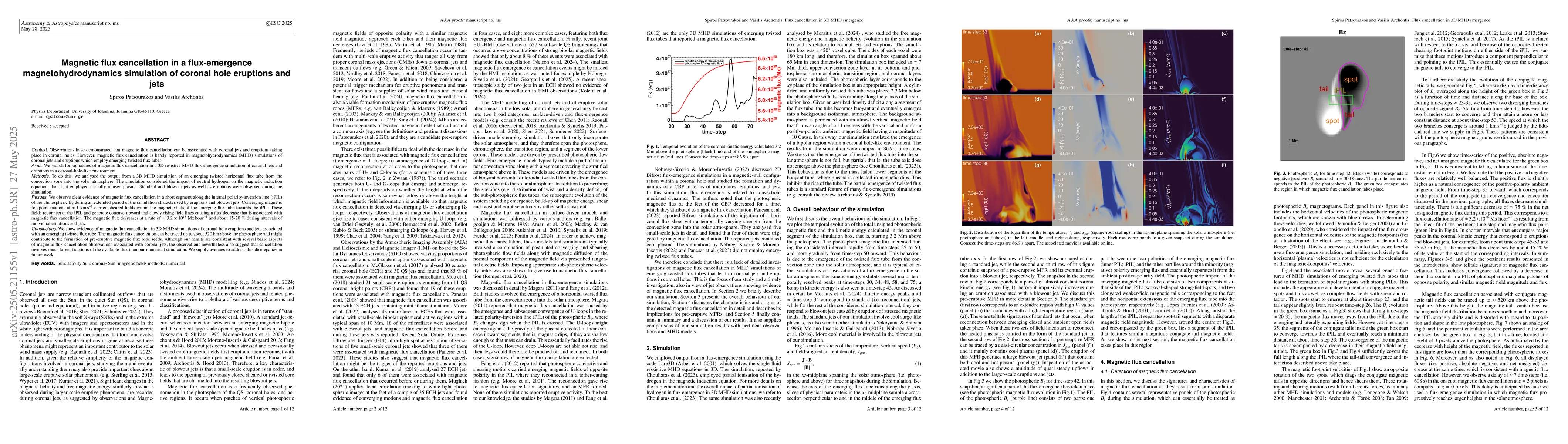 The research demonstrates the occurrence of magnetic flux cancellation in 3D MHD simulations of coronal hole eruptions and jets associated with an emerging twisted flux tube, providing a deeper understanding of the magnetic reconnection processes.