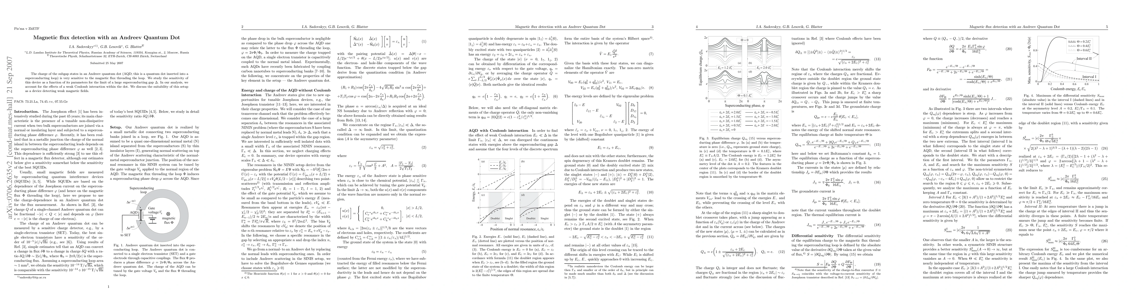The charge of the subgap states in an Andreev quantum dot (AQD; this is a quantum dot inserted into a superconducting loop) is very sensitive to the magnetic flux threading the loop. We study the sensitivity of this device as a function of its parameters for the limit of a large superconducting gap. In our analysis, we account for the effects of a weak Coulomb interaction within the dot. We discuss the suitability of this setup as a device detecting weak magnetic fields.