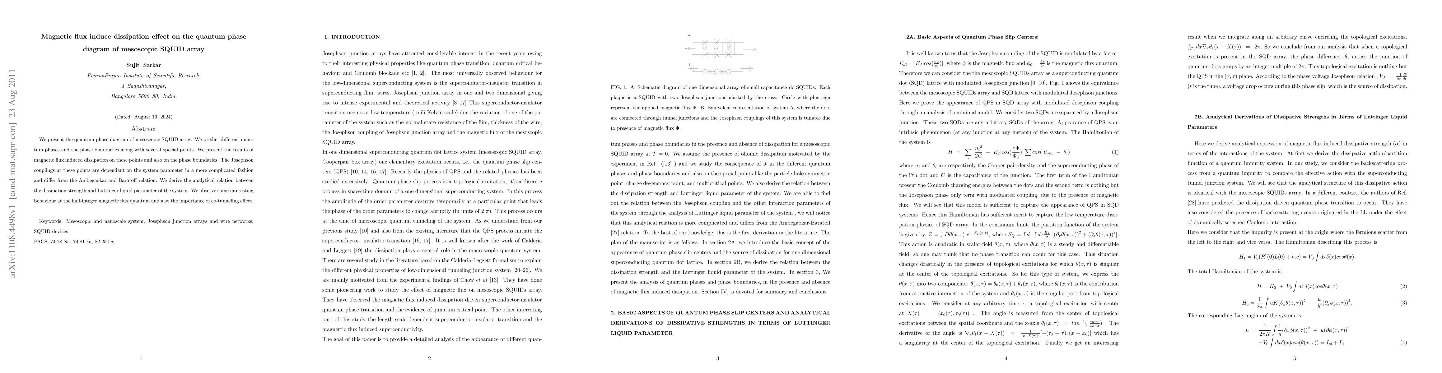 This paper explores the quantum phase diagram of a mesoscopic SQUID array, predicting various quantum phases and their boundaries. It investigates the impact of magnetic flux-induced dissipation on these phases, revealing complex dependencies of Josephson couplings and deriving an analytical relation between dissipation strength and the Luttinger liquid parameter, highlighting notable behavior at half-integer magnetic flux quantum and the significance of co-tunneling effects.